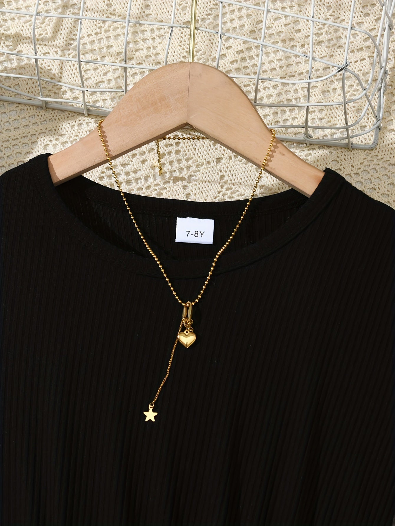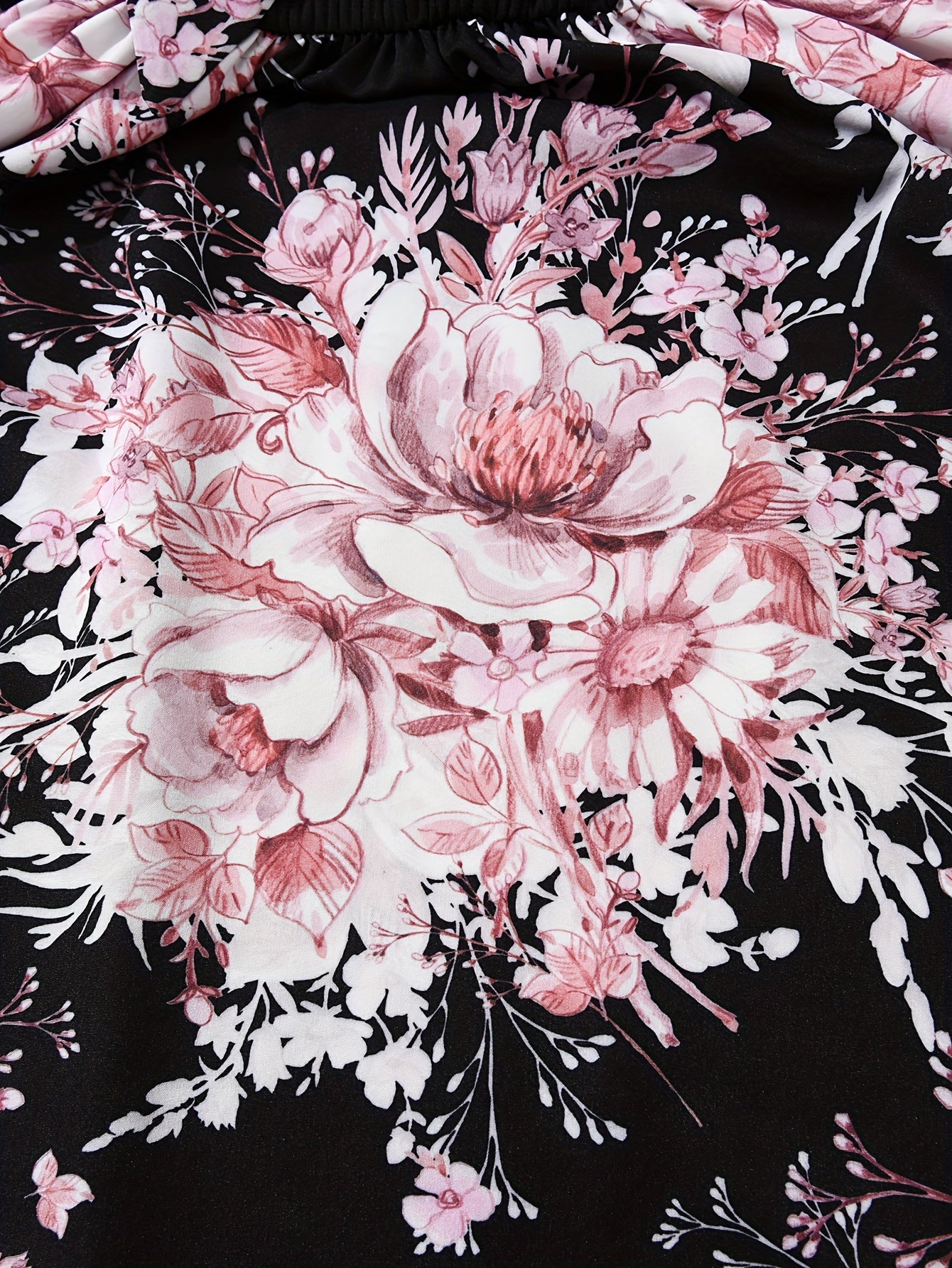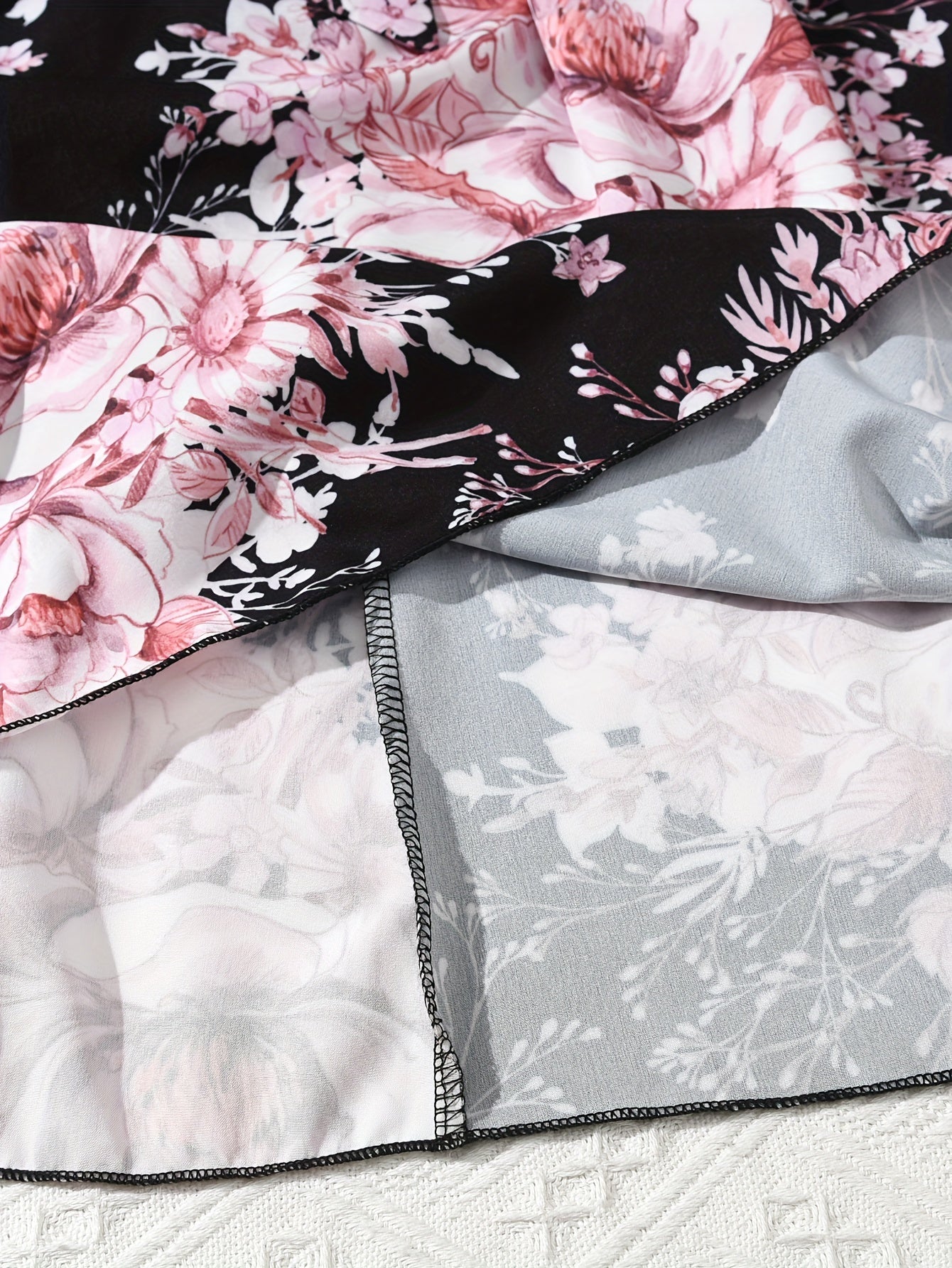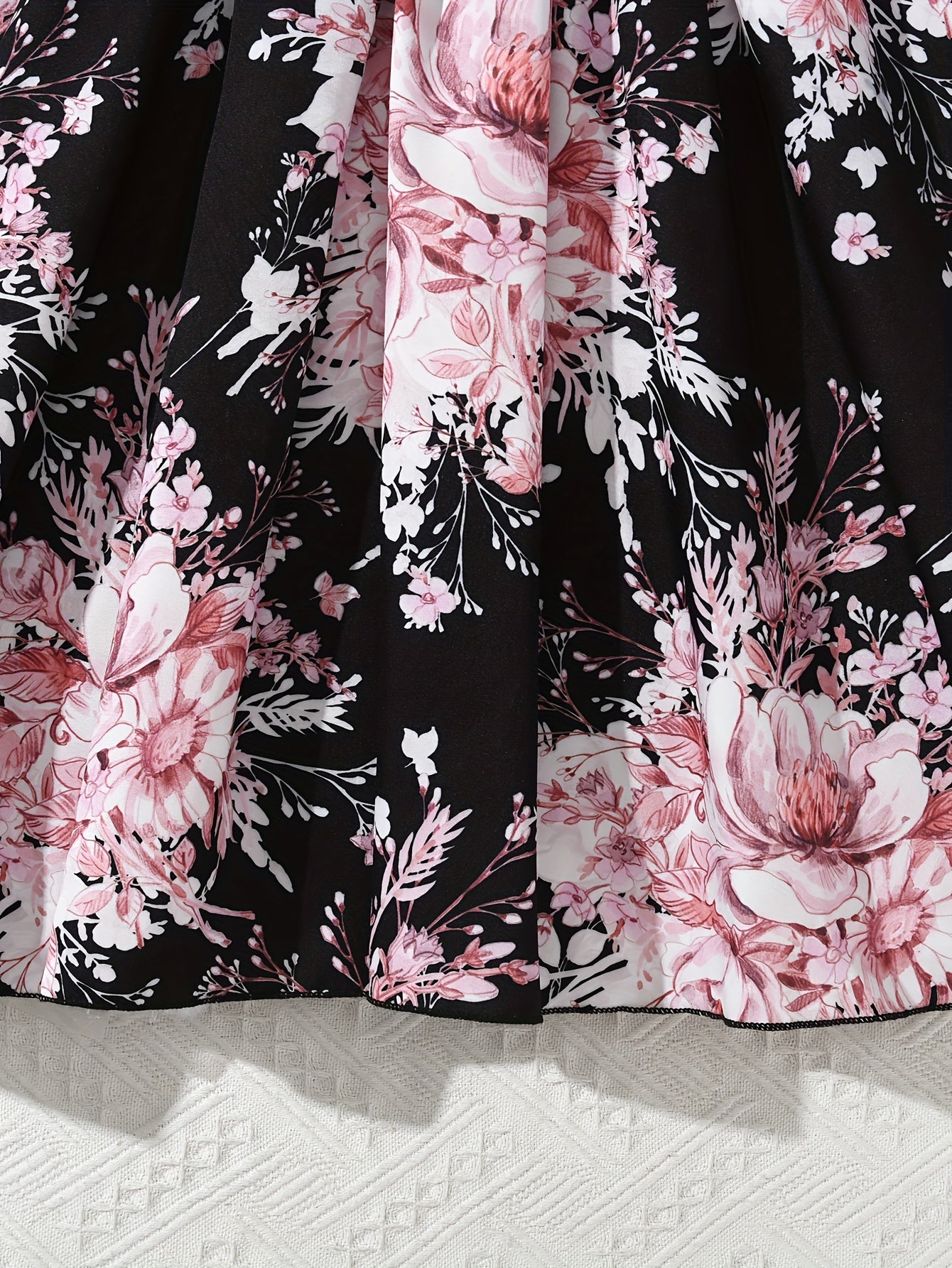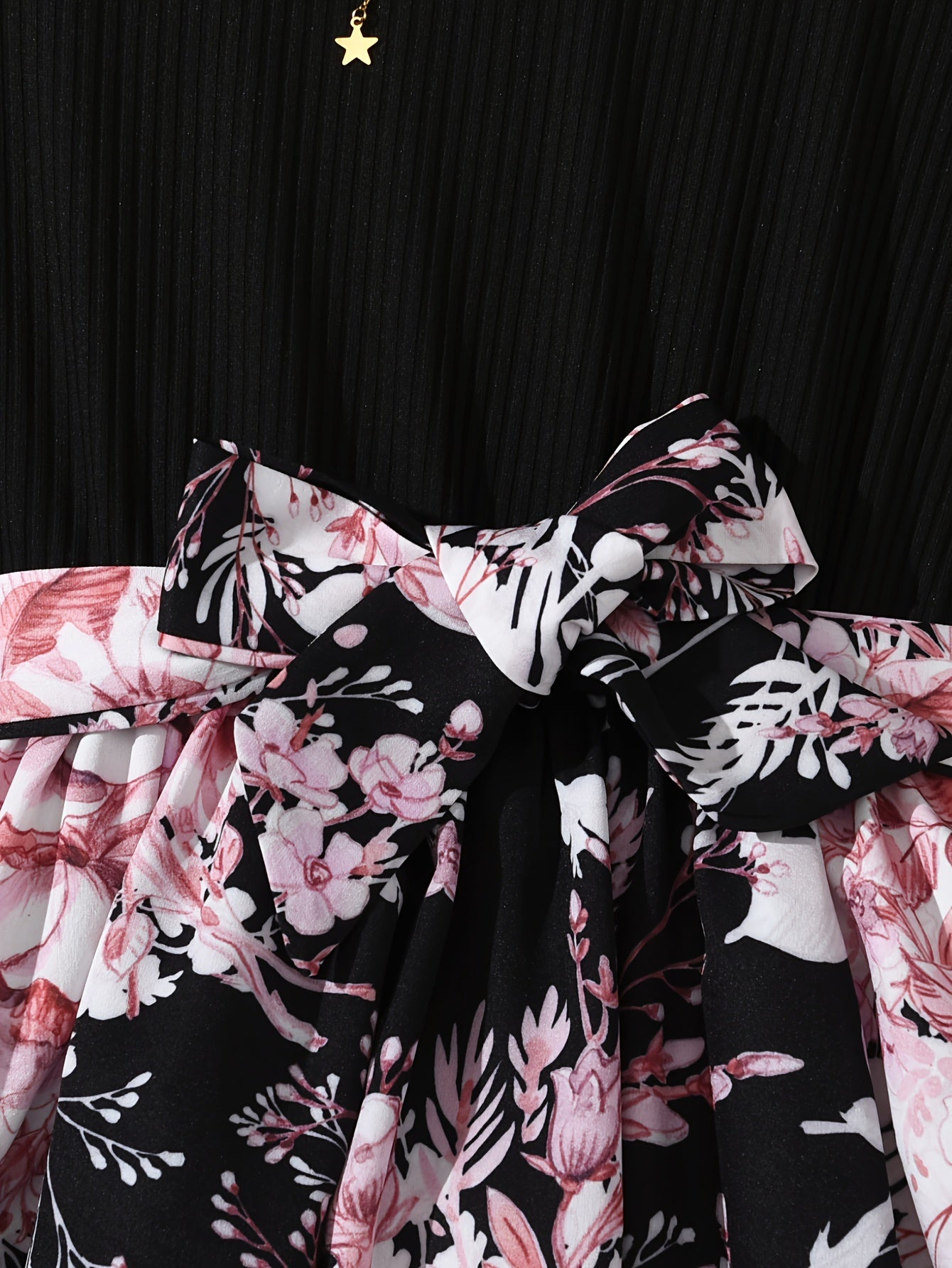 Girls Summer Blue Floral Spliced Knee High Dress with Belt and Short Sleeves
