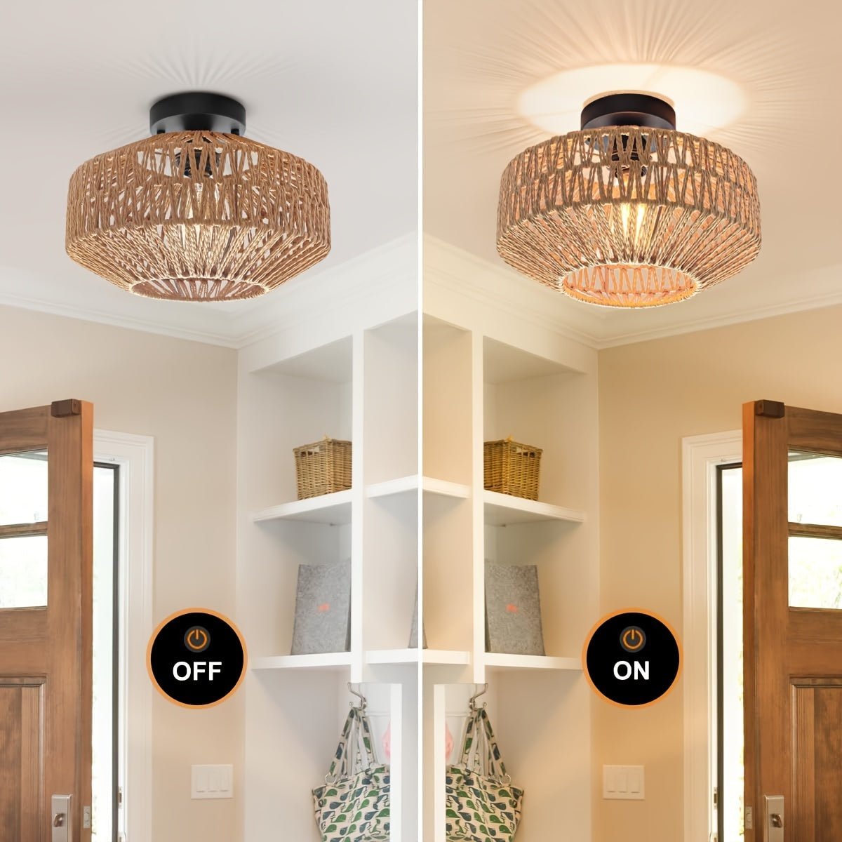 Bohemian Rattan Semi-Flush Mount Ceiling Light Fixture with Modern Metal Frame