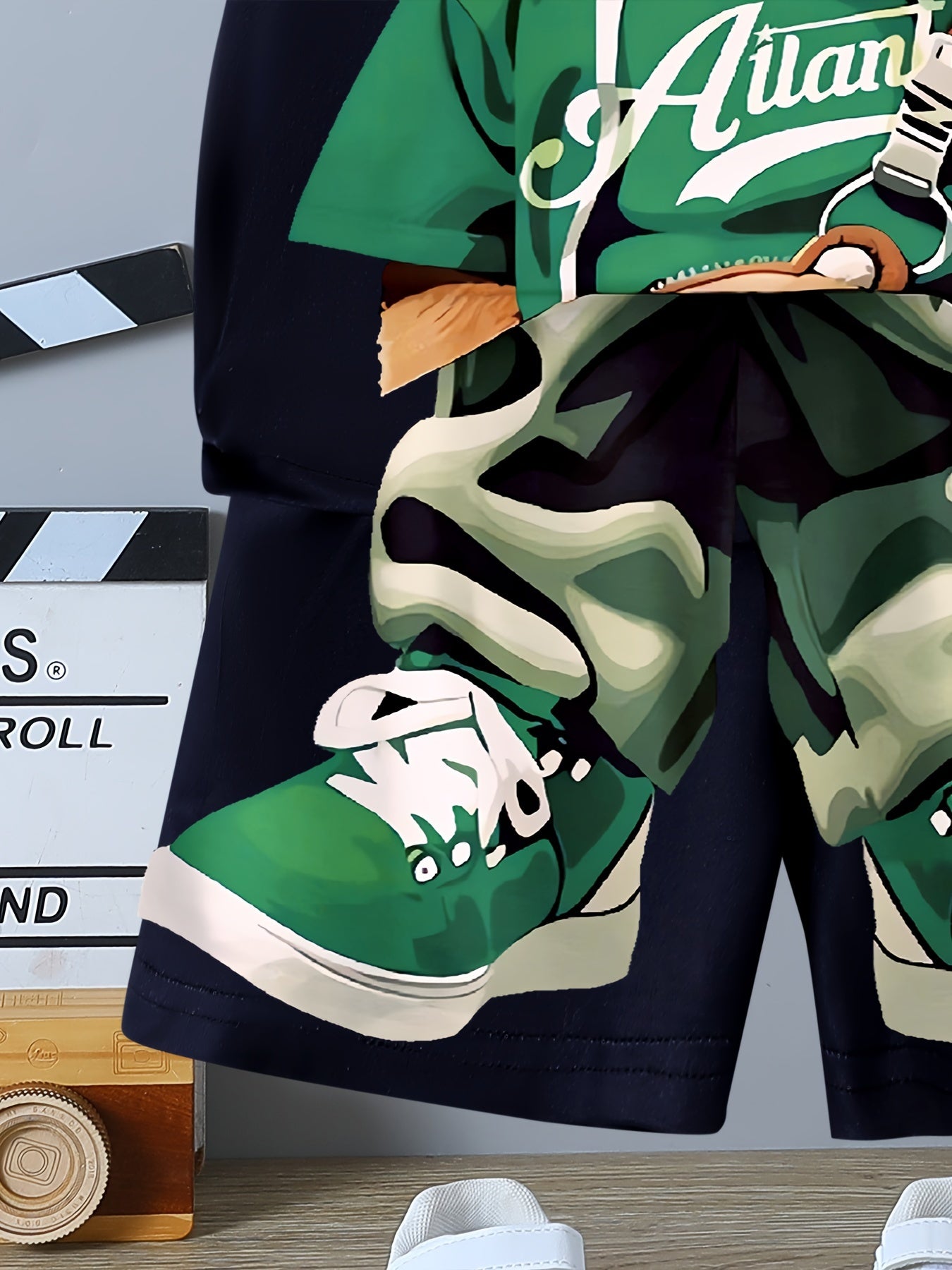 Boys' Summer Cartoon Bear Outfit Crew Neck T-Shirt and Knit Shorts Regular Fit