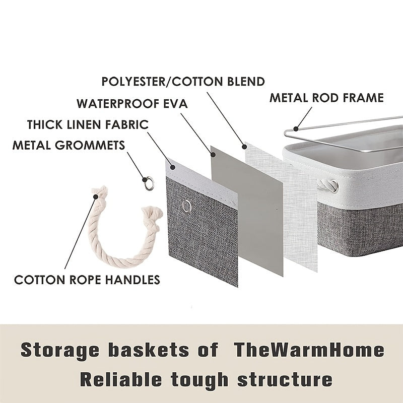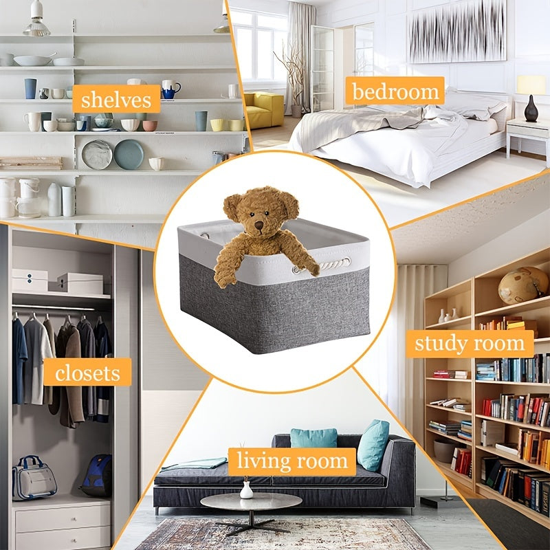 Gray and White Linen Storage Basket with Rope Handles for Closet and Nursery Organization