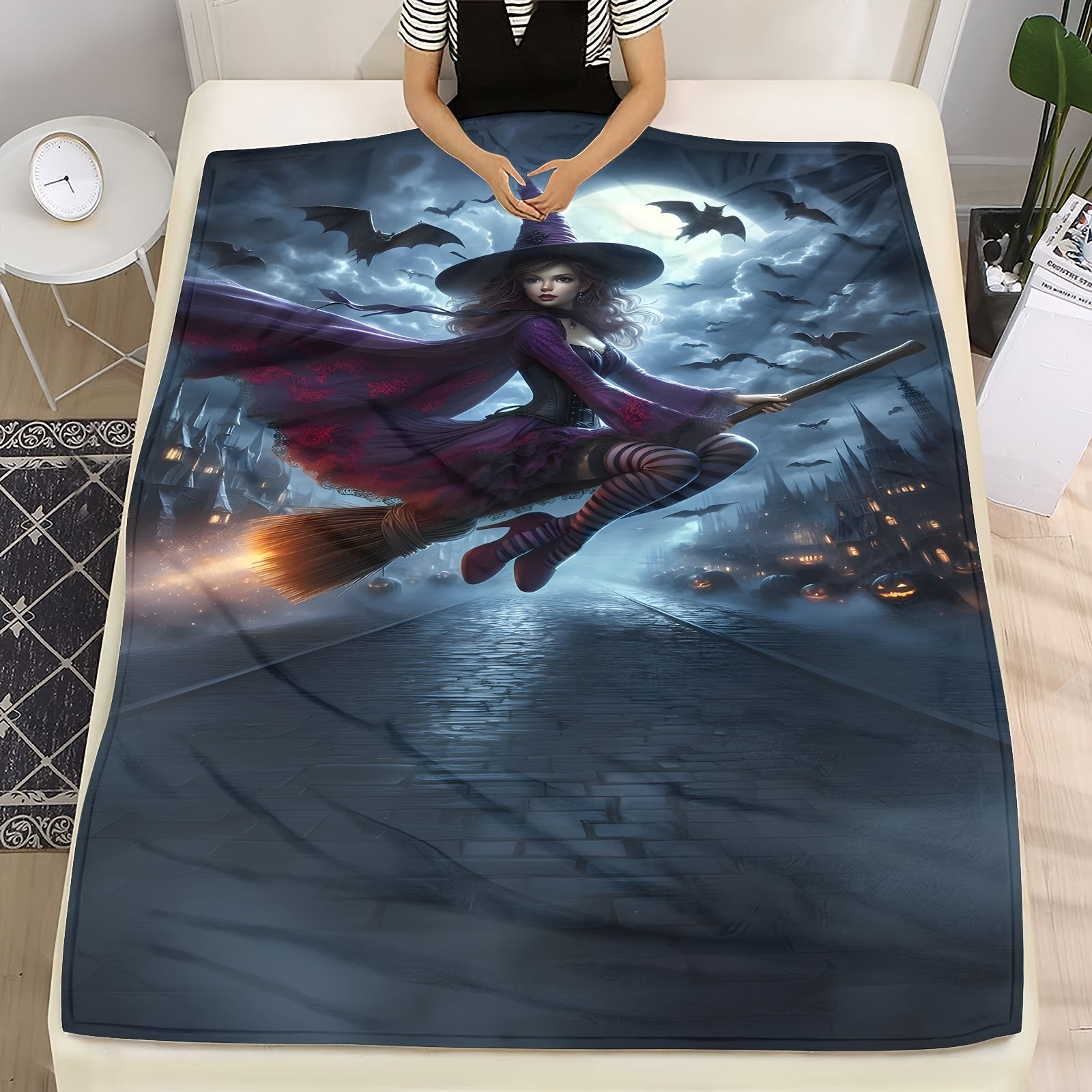 Halloween Witch Broom Flannel Blanket Quilted Anime Bedding Hypoallergenic All-Season Polyester Throw for Sofa Bed Camping