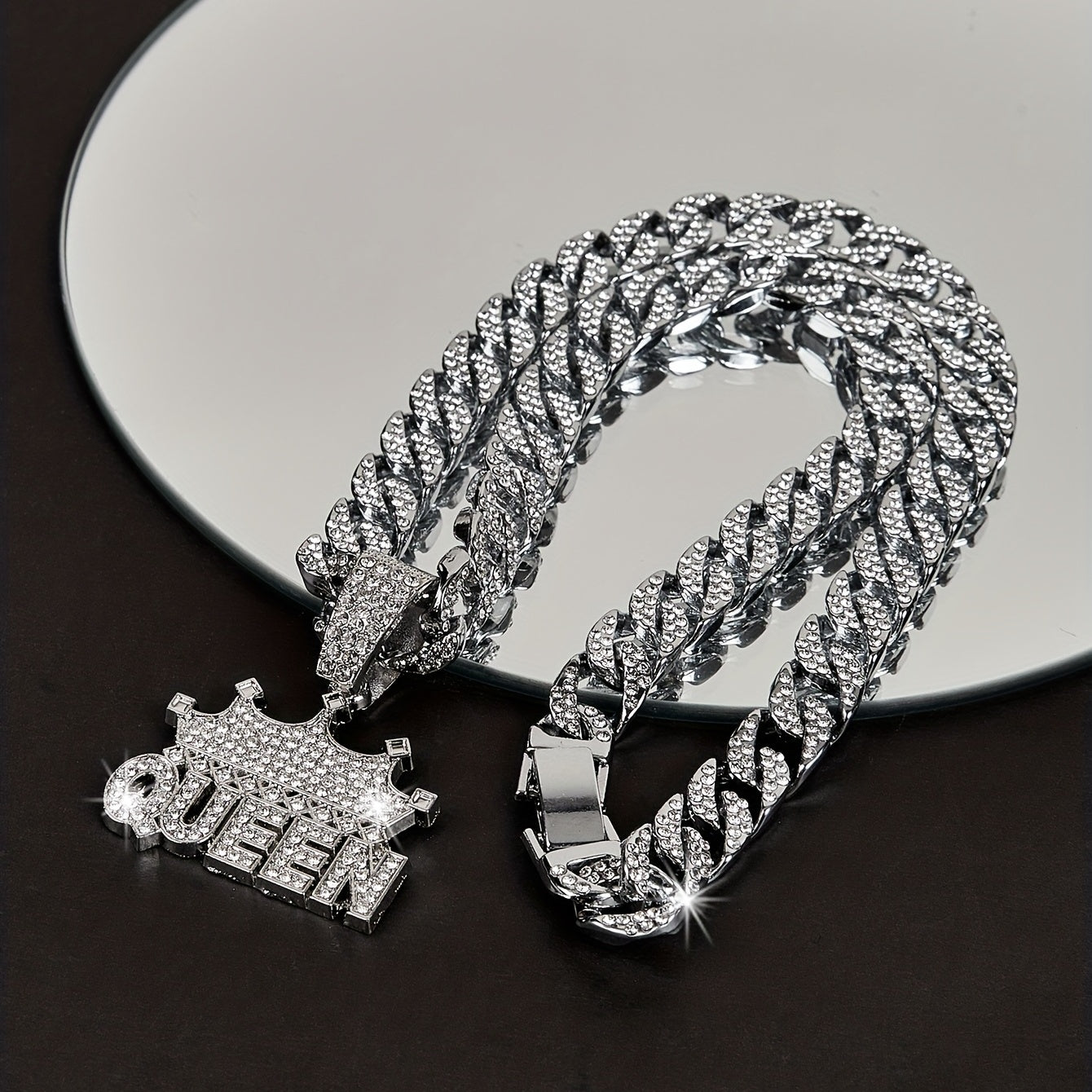 Women's Cuban Link Chain Necklace with Crown Queen Pendant Rhinestones Hip Hop Style