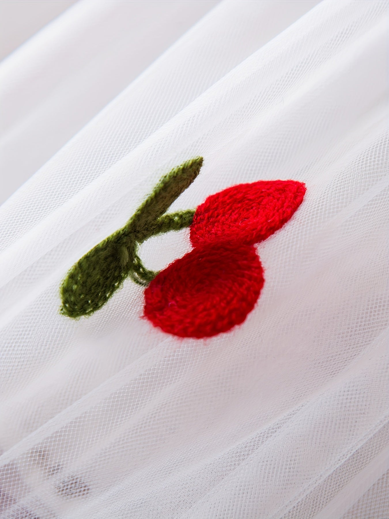Girls Summer Dress Pink Cherry Embroidered Tulle Ruffled Sleeve Casual Lightweight Polyester