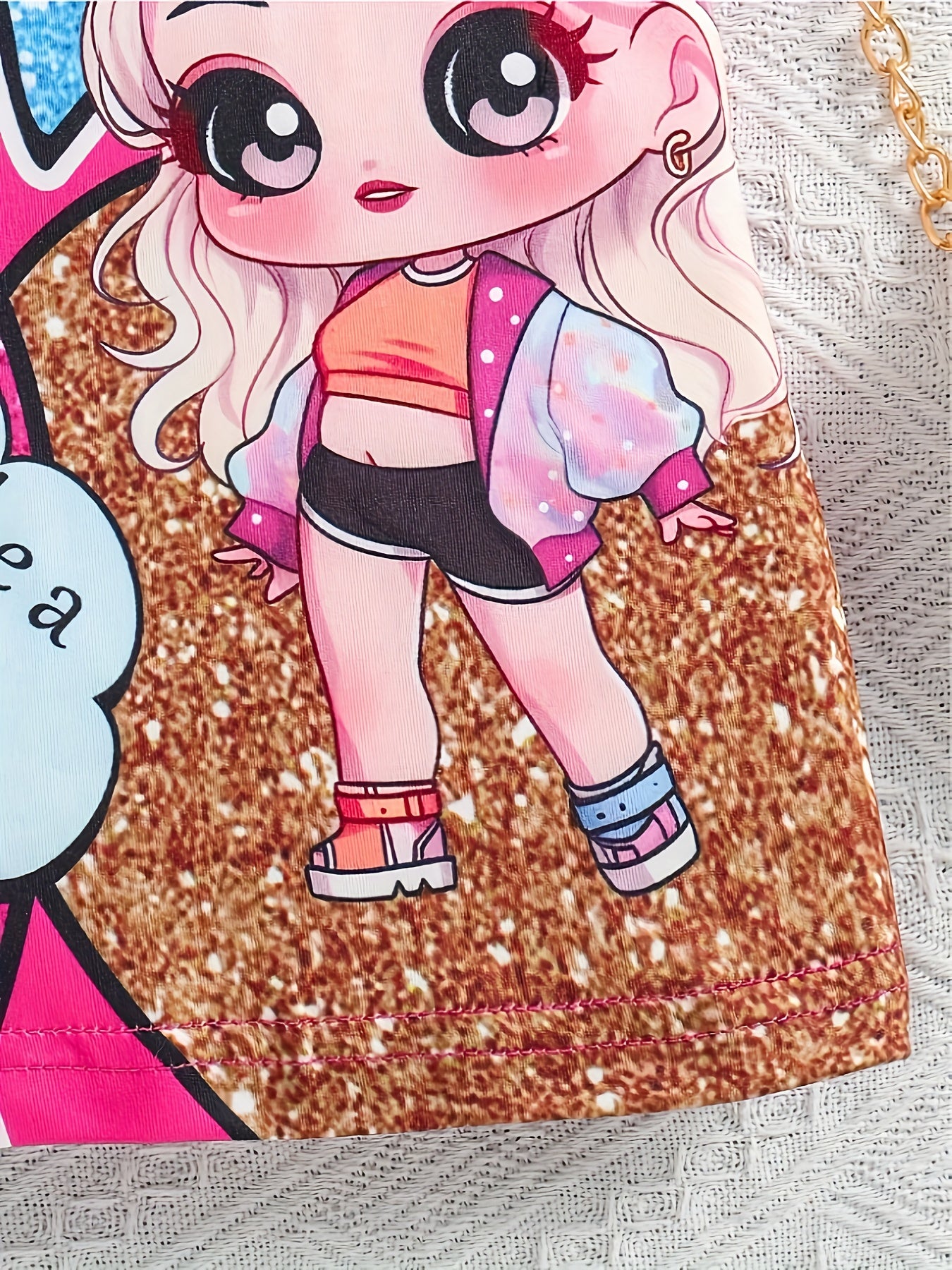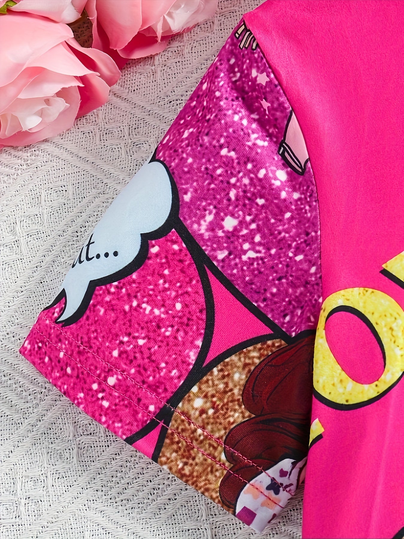 Girls' Pink Cartoon Dress with "LOVE" Print, Polyester Blend, Spring Summer Fall