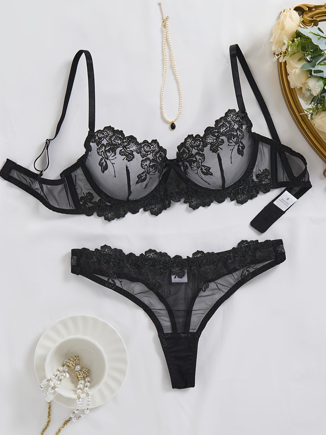 Floral Embroidered Lingerie Set for Women Medium Support Underwire Bra and Briefs