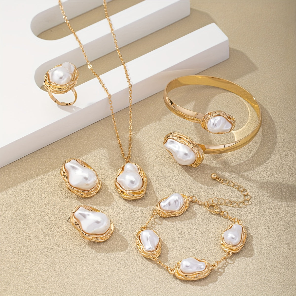 Women’s 14K Gold Plated Jewelry Set with Faux Pearls Necklace Earrings Ring Bangle