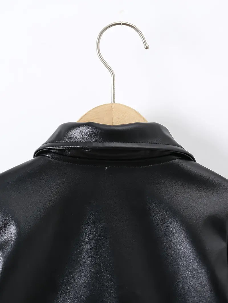 Faux Leather Jacket for Kids with Lapel and Diagonal Zipper Short Length Fall Winter