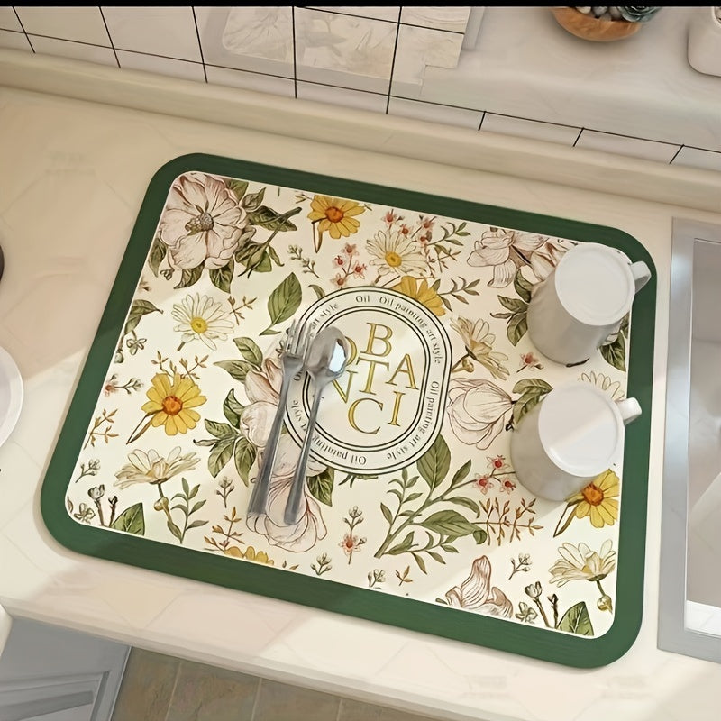 Floral Diatomite Dish Drying Mat, Machine Washable, Fast-Drying Kitchen Countertop Pad