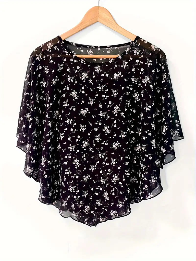 Floral Print Asymmetrical Blouse for Women Sheer Sleeves Sun Protection Beachwear