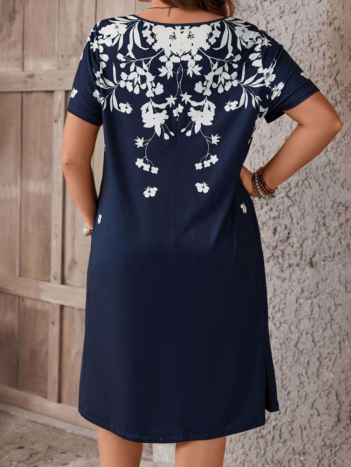 Plus Size Floral Print Dress with Pockets Short Sleeve Crew Neck for Spring Summer