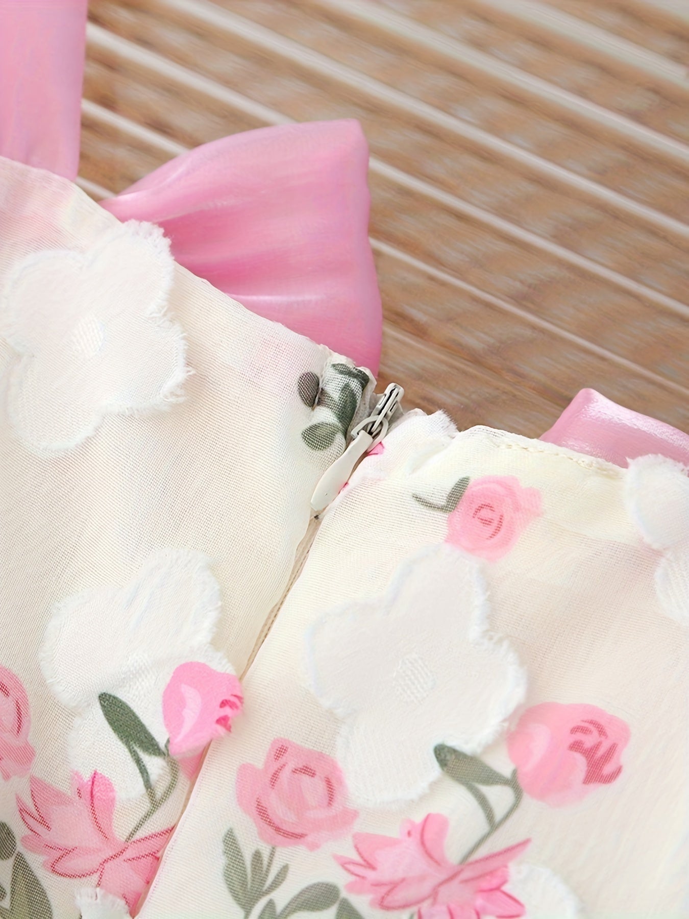 Girls Summer 3D Flower Princess Dress with Puff Sleeves and Bowknot for Birthday