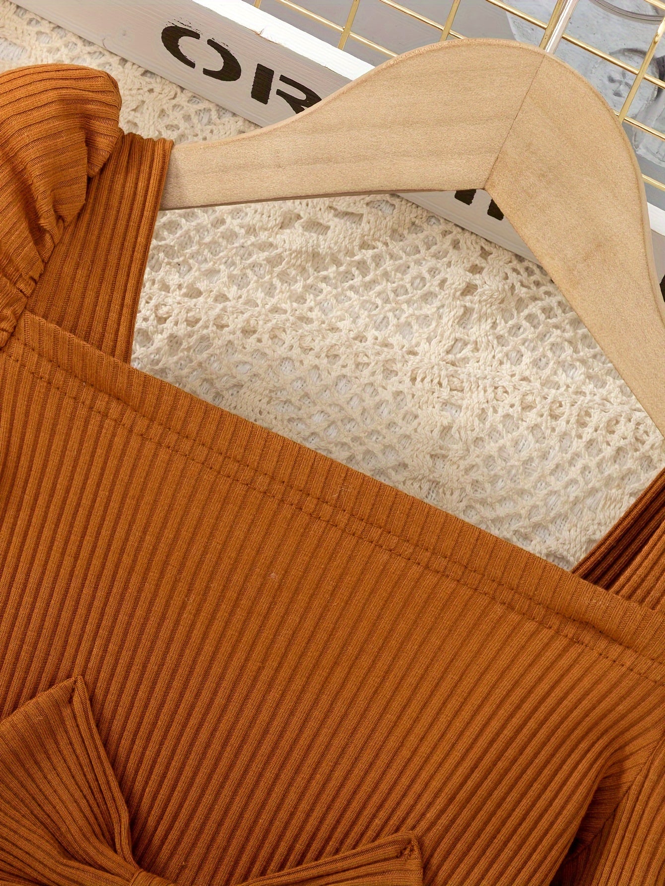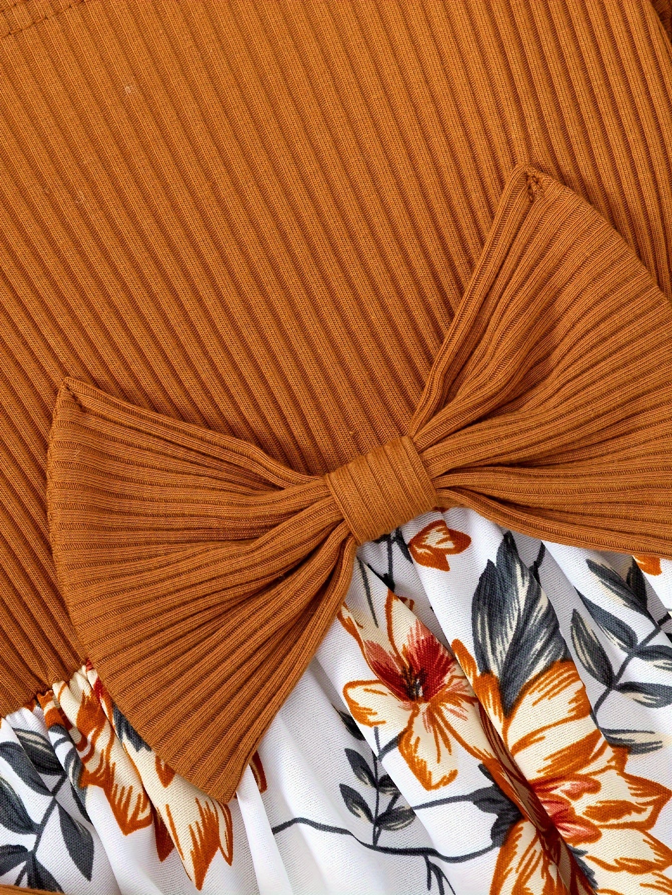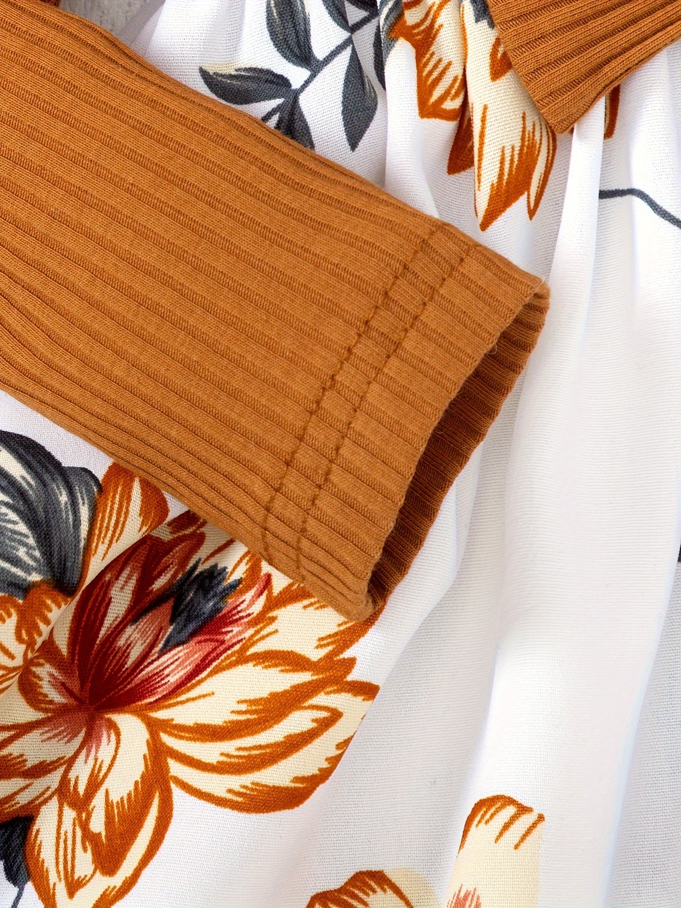 Girls Floral Print Midi Dress with Ruffle Shoulders Long Sleeves Cotton Knit All-Season