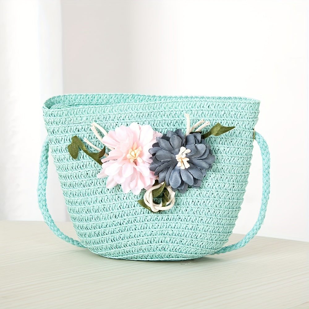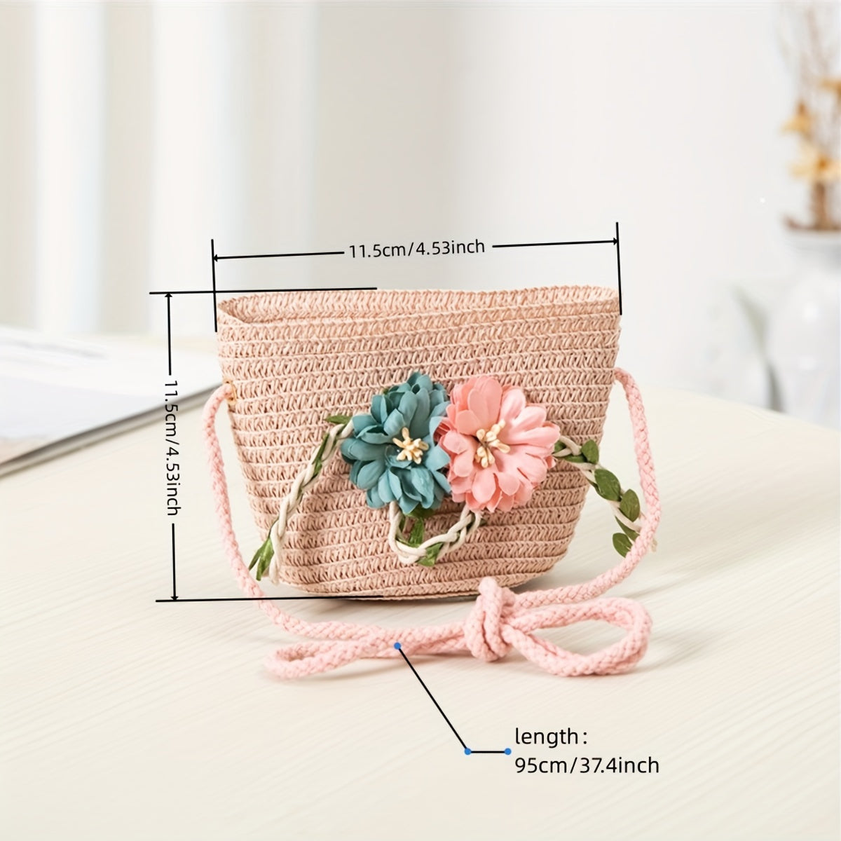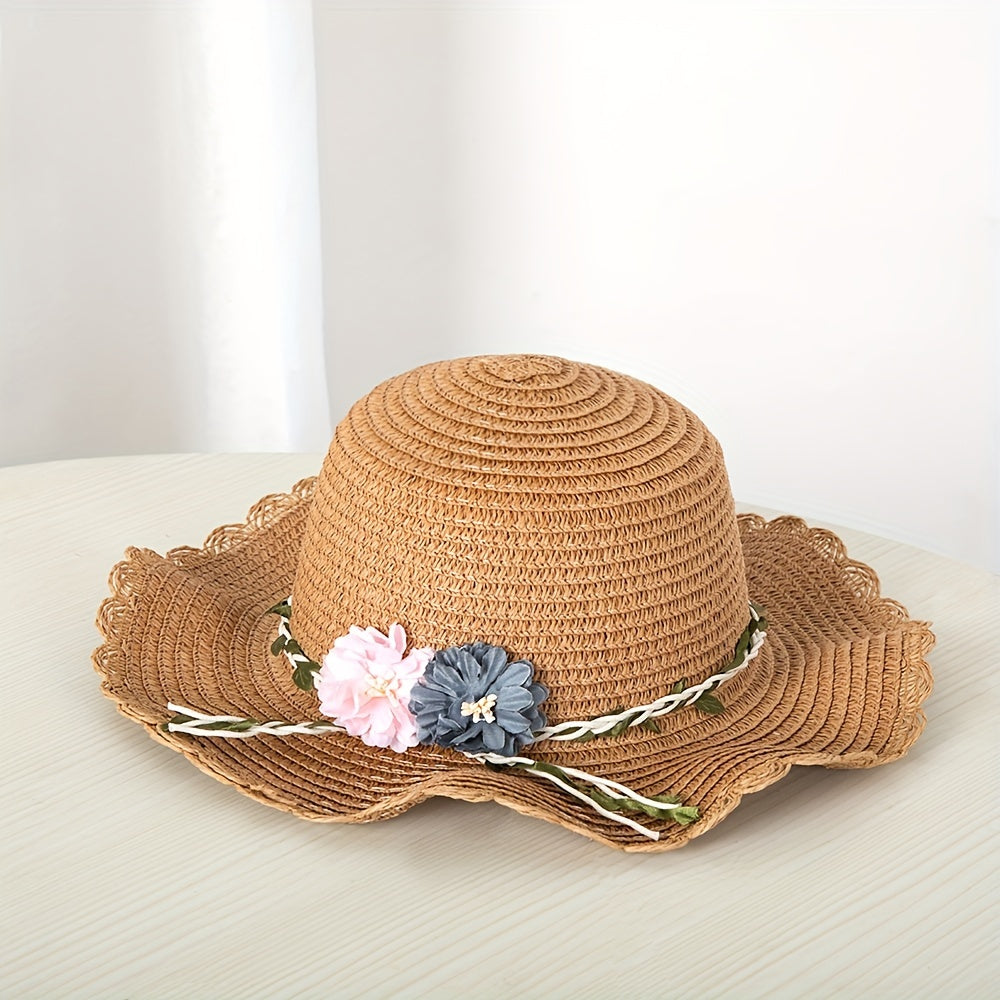 Girls' Straw Hat Set with Flower Decoration and UV Protection for Summer Beach Vacation