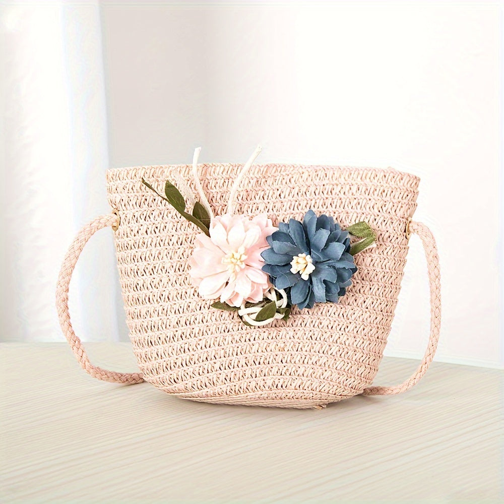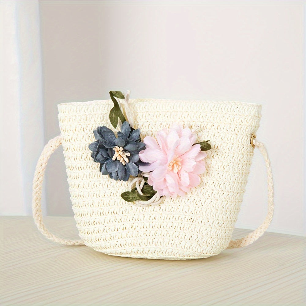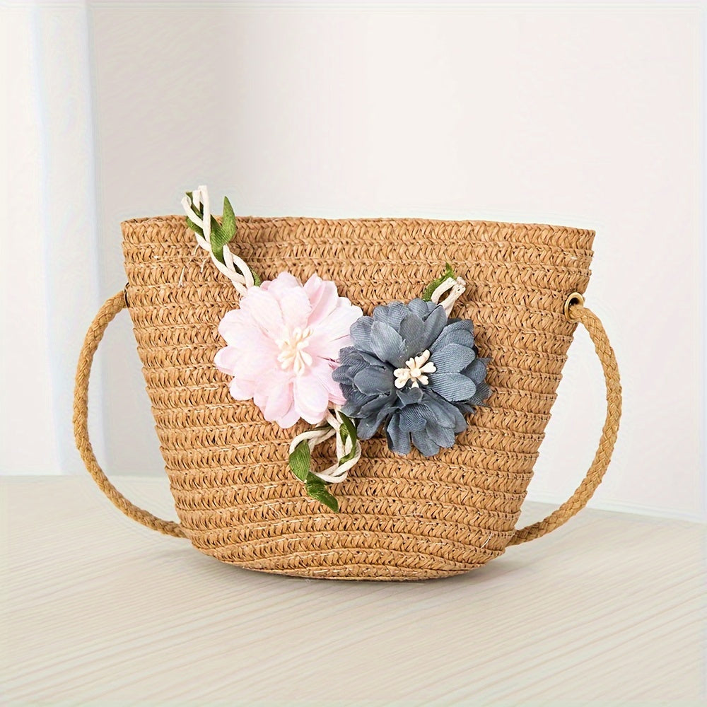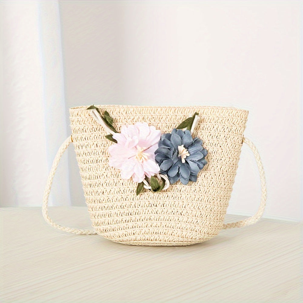 Girls' Straw Hat Set with Flower Decoration and UV Protection for Summer Beach Vacation