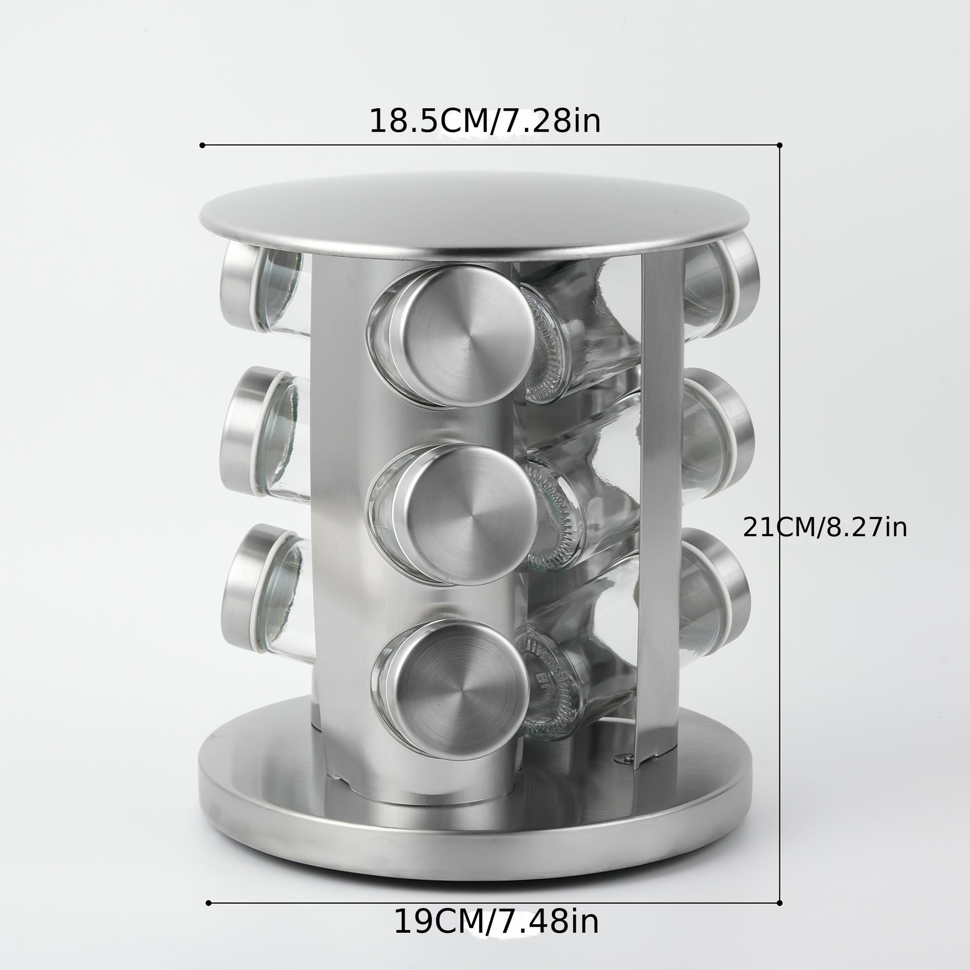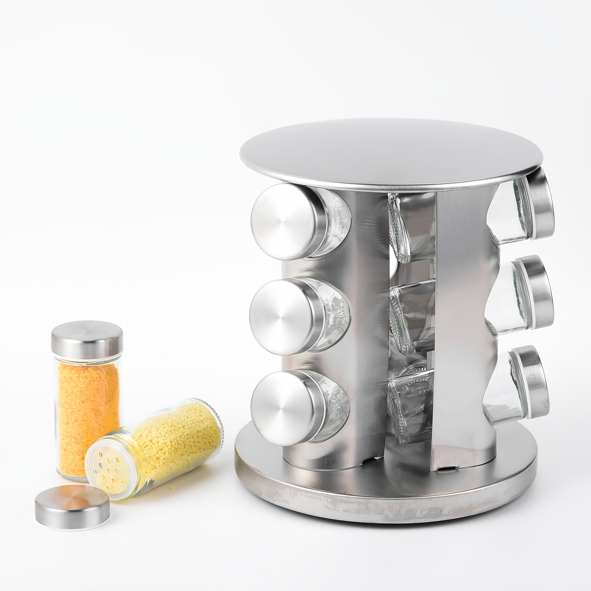 Golden Rotating Spice Jar Set with 9 Glass Jars and Revolving Storage Rack