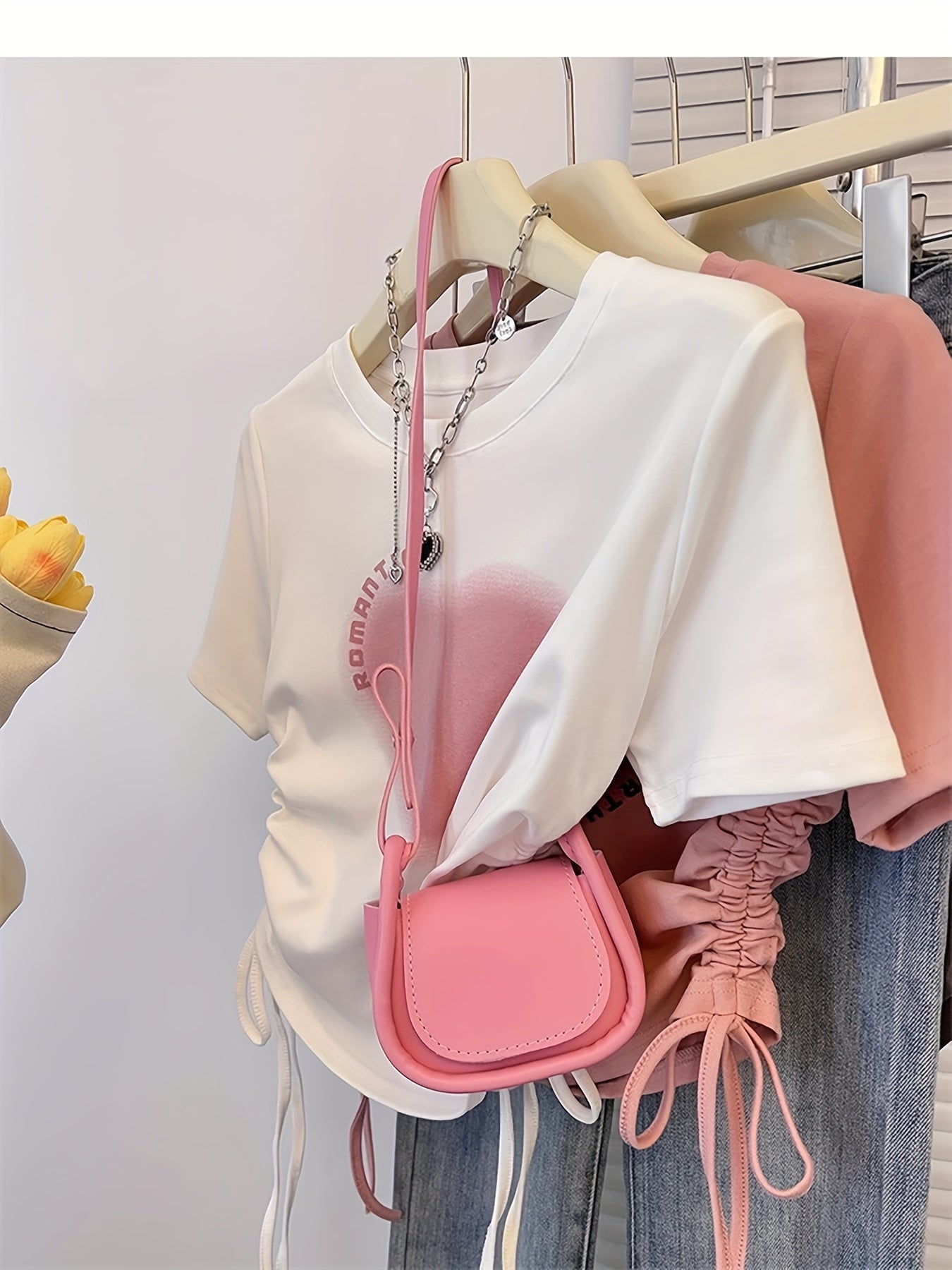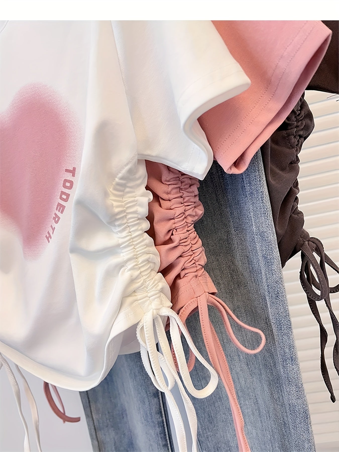 Women's Heart Print Crop Top Short Sleeve Drawstring Summer T-Shirt