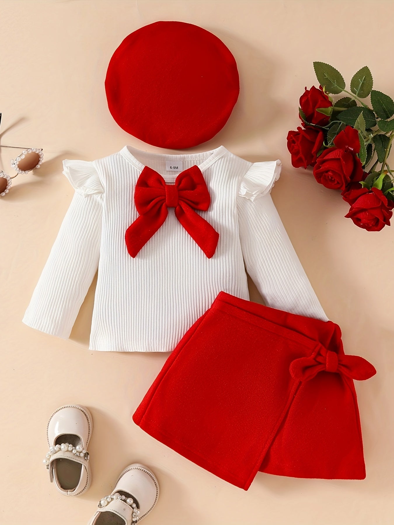 Girls Knit T-Shirt Set with Flared Skirt and Beret for Fall Winter
