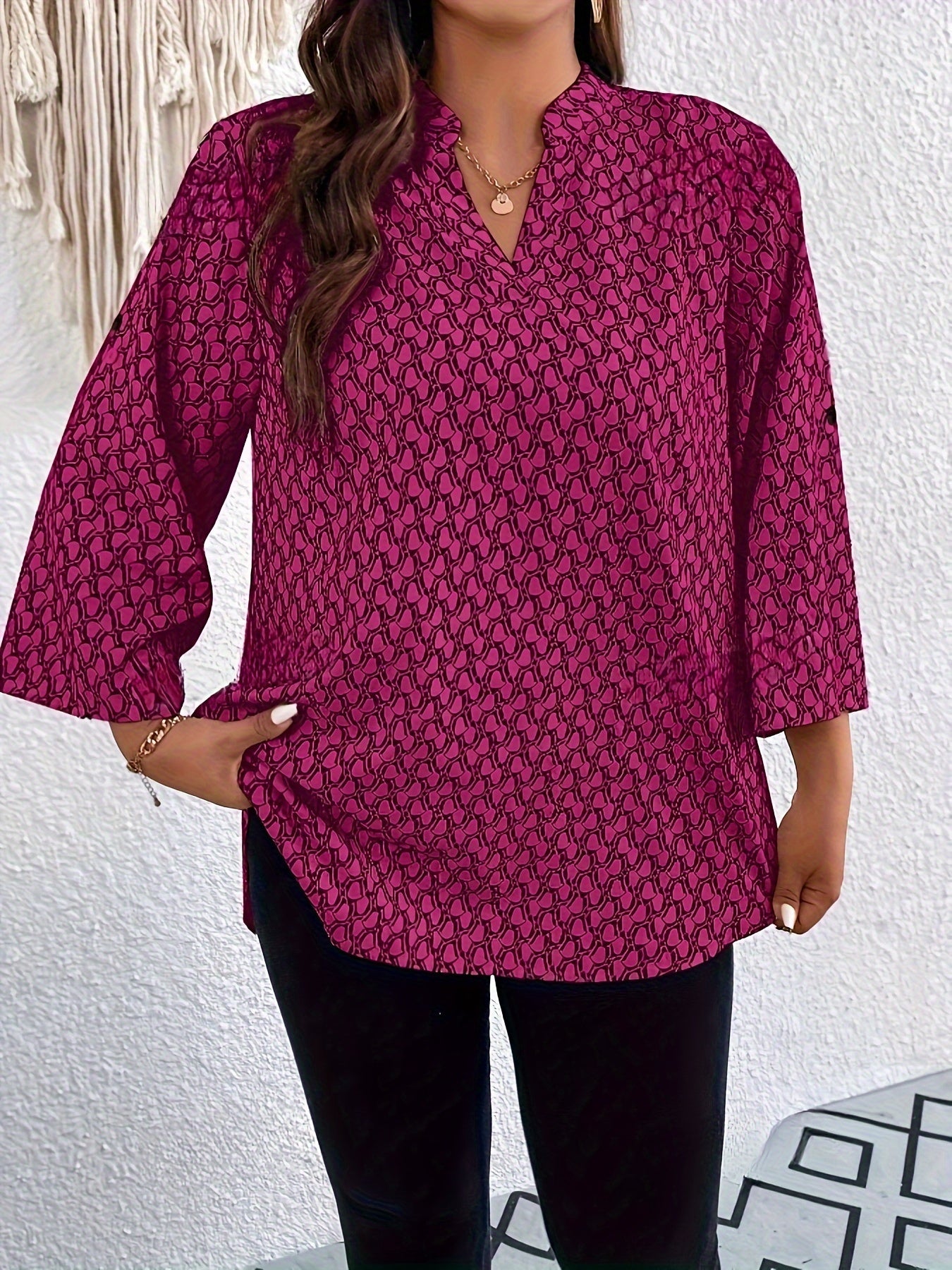 Ladies Print Blouse with Notched V-Neck Rolled Sleeves Casual Formal Wear