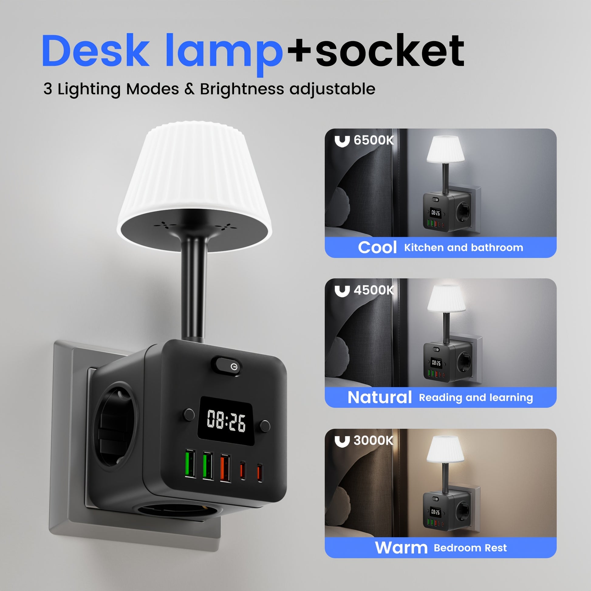 Power Strip with Lamp and Digital Clock 3 AC Outlets 3 USB-A 2 USB-C Surge Protection