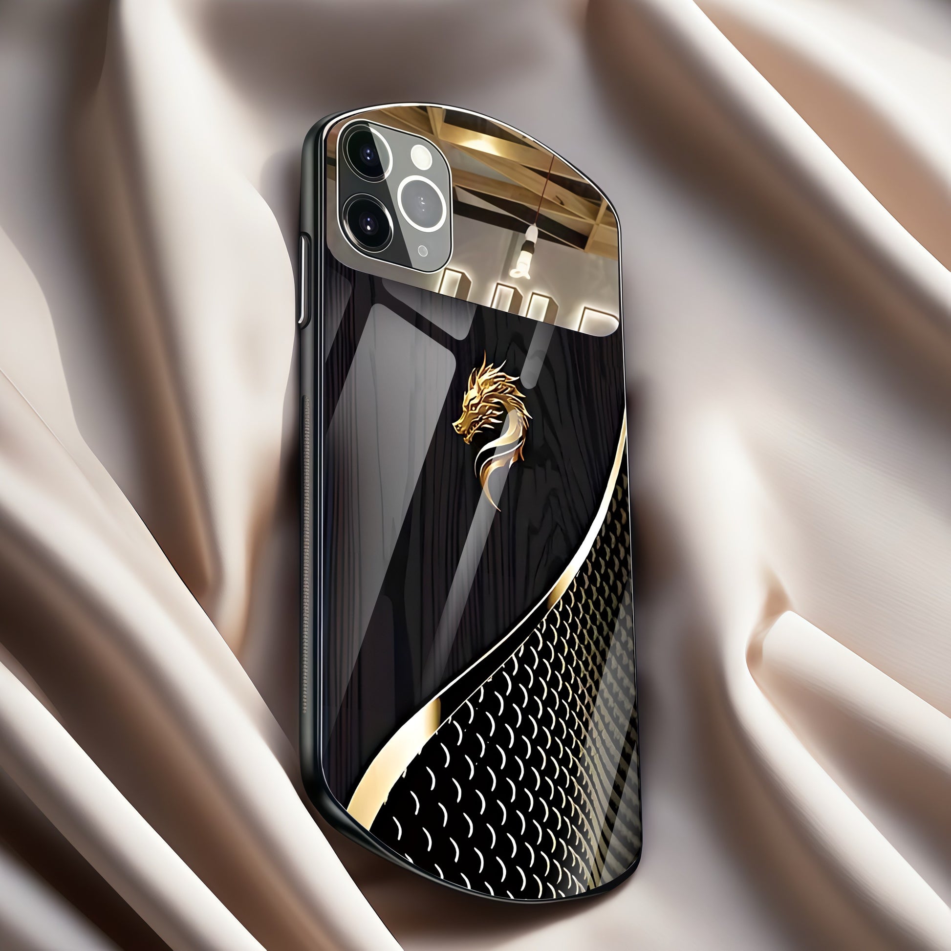 Luxury Golden Dragon Faux Wood Grain Oval Glass Phone Case for iPhone 11 Pro Max and Later Models