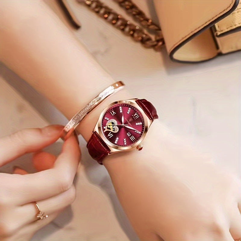 Women's Heart-Shaped Rhinestone Watch with Luminous Dial and Leather Band