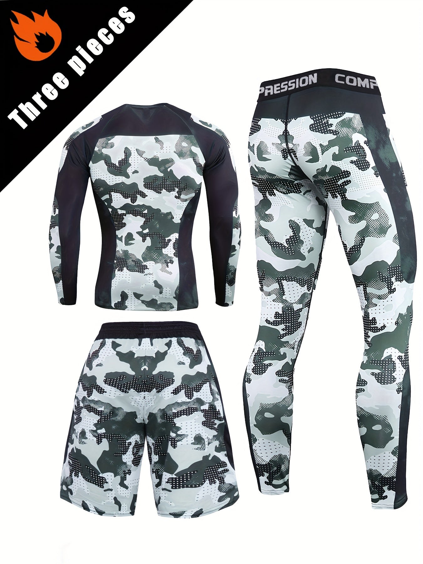 Men's Camo Compression Set Long Sleeve Top Shorts Leggings Athletic Training Outdoor