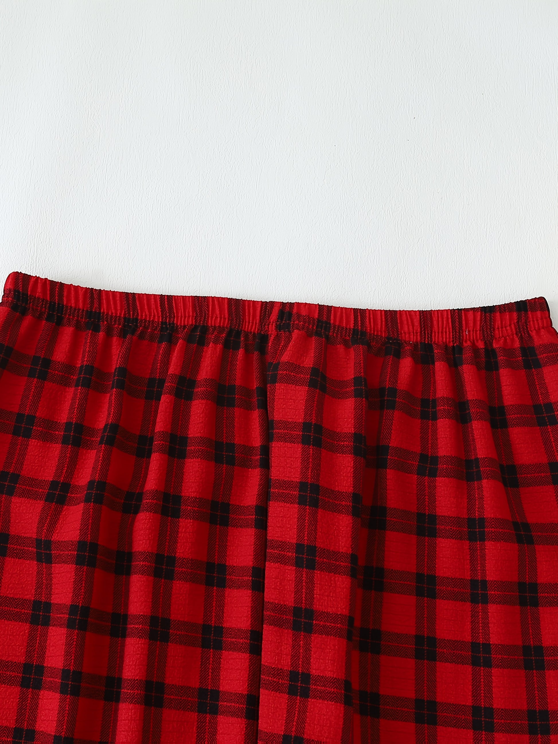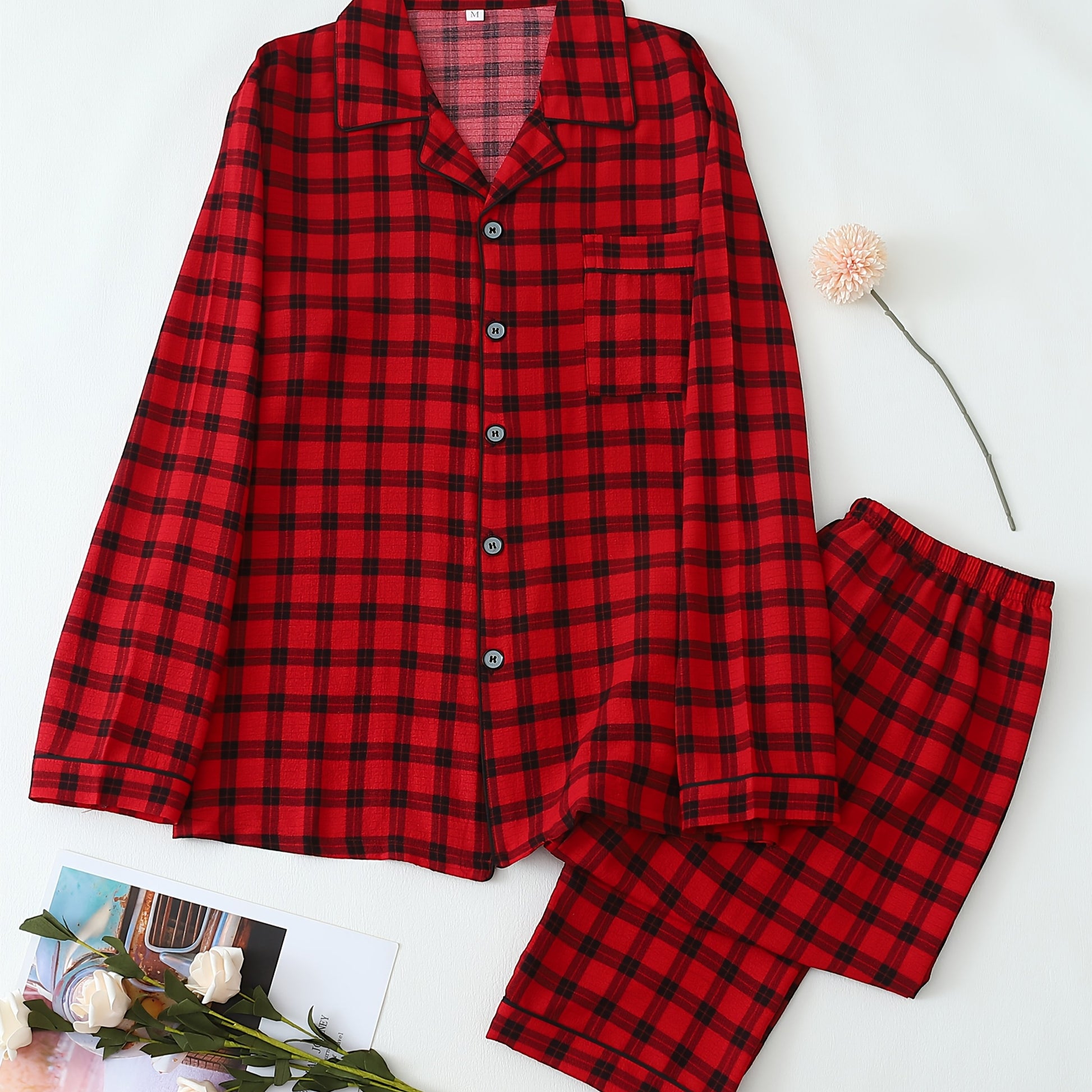 Men's Red Plaid Pajama Set Long Sleeve Polyester Knit Casual Sleepwear