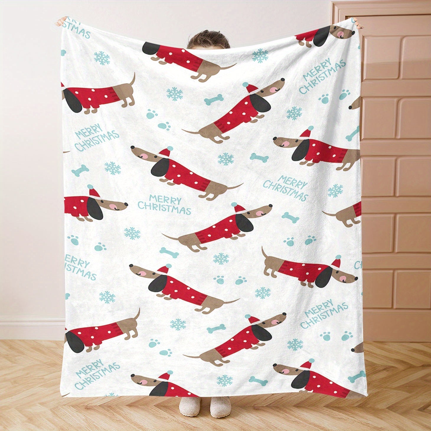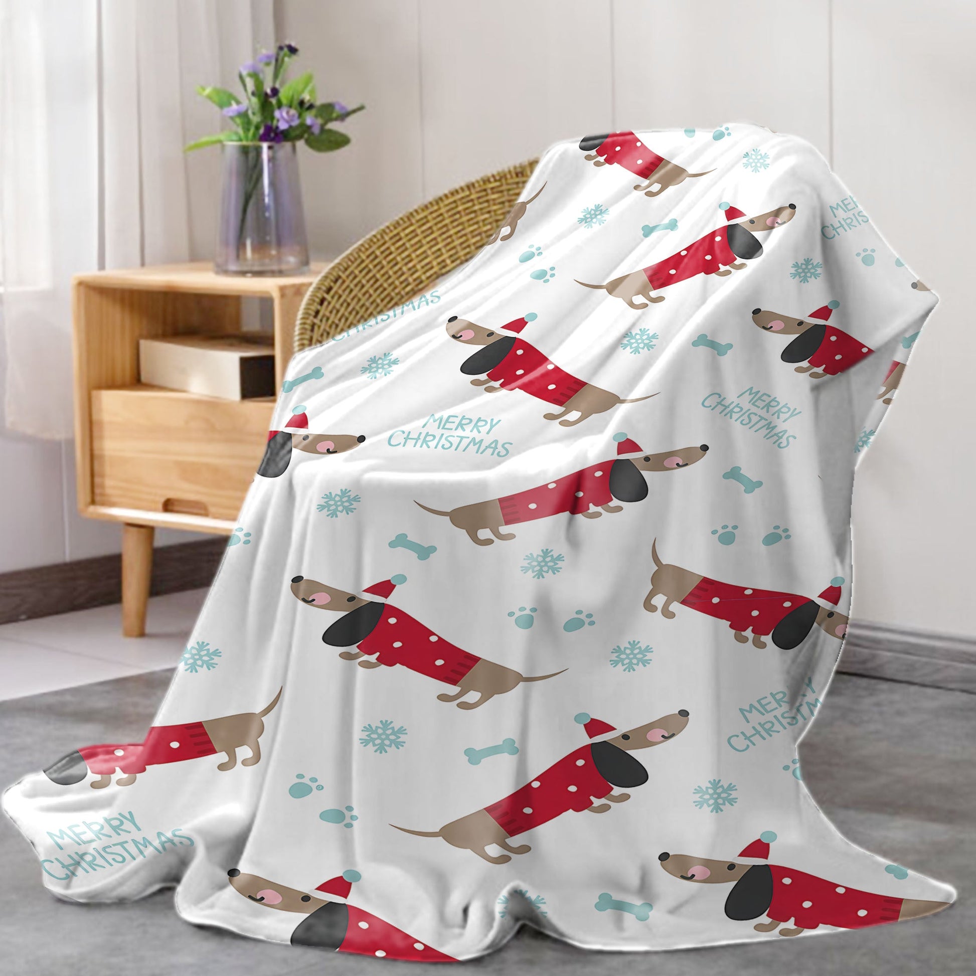 Mid-Century Modern Dachshund Christmas Throw Blanket Flannel Polyester Cartoon Dog All-Season