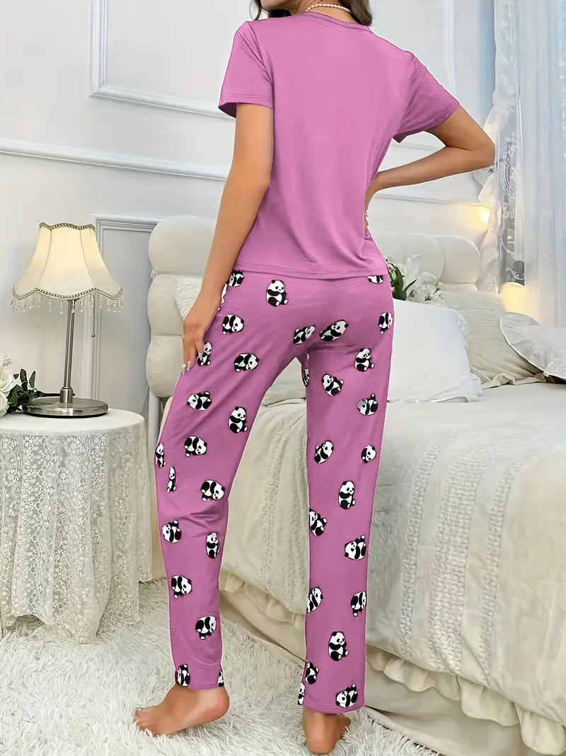 Adult Panda Print Pajama Set with Cartoon Pattern, 100% Polyester, Fall Casual Sleepwear