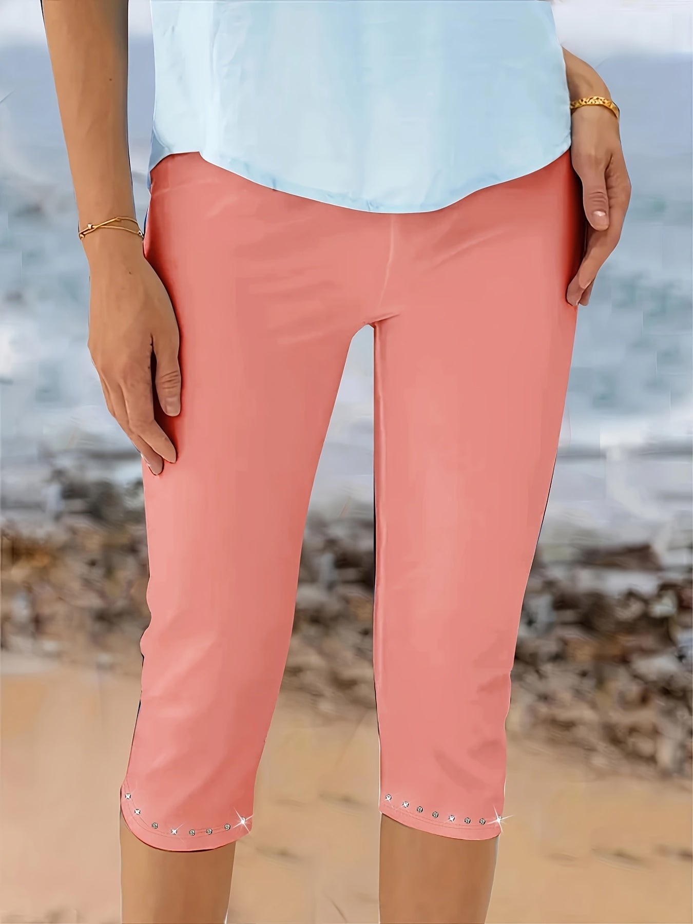 Plus Size Rhinestone Decor Capri Leggings High Waist Stretchy Spring Summer Women