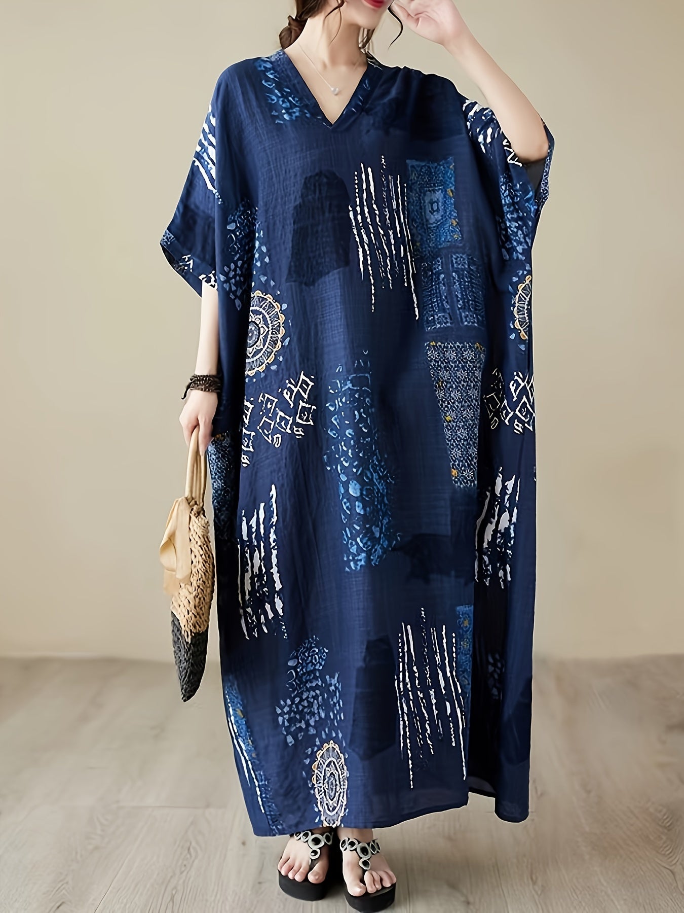Plus Size V-Neck Kaftan Dress Short Sleeve Casual All-Season Woven Gown