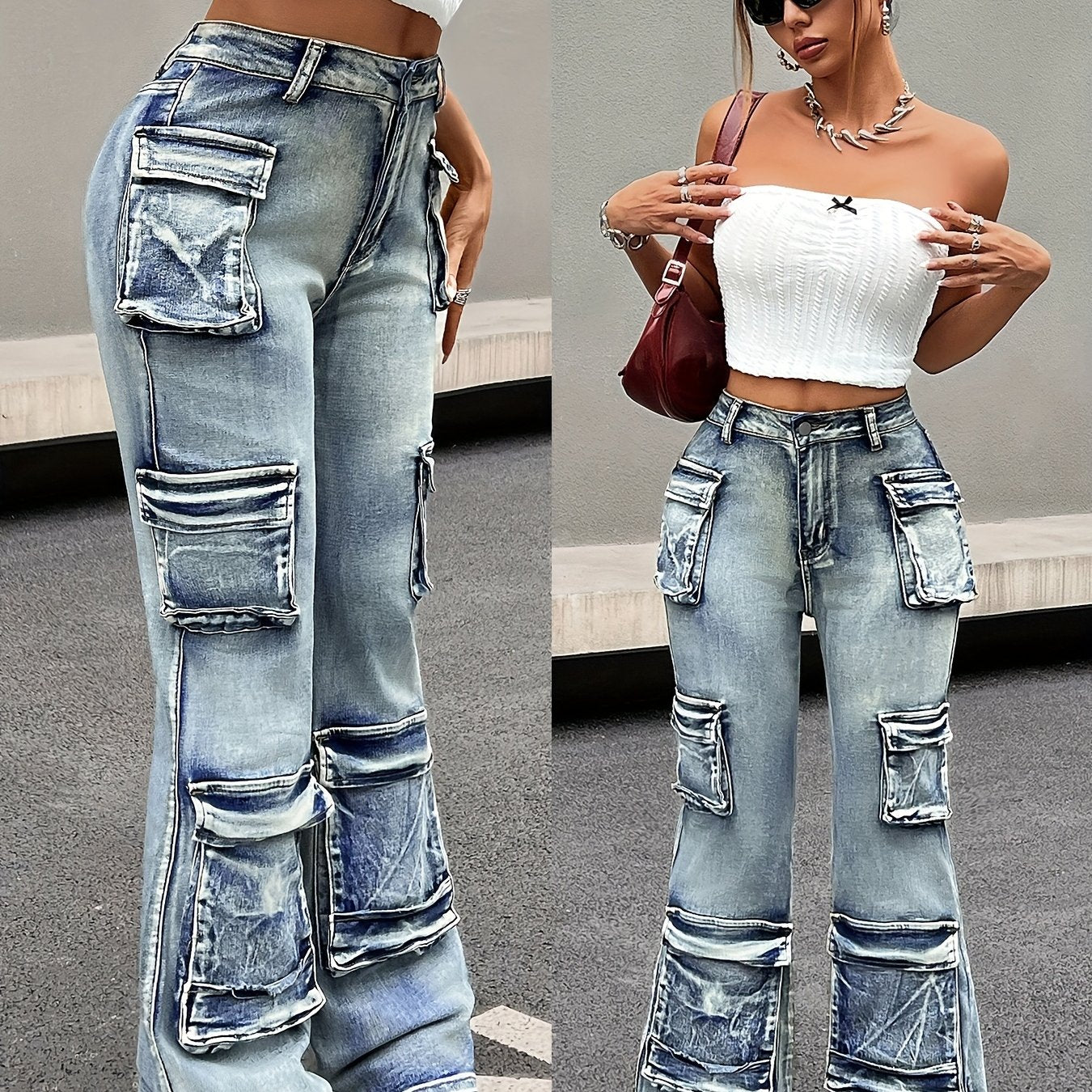 Plus Size Women's High-Waisted Stretch Denim Flared Cargo Pants Multi-Pocket Winter Workwear