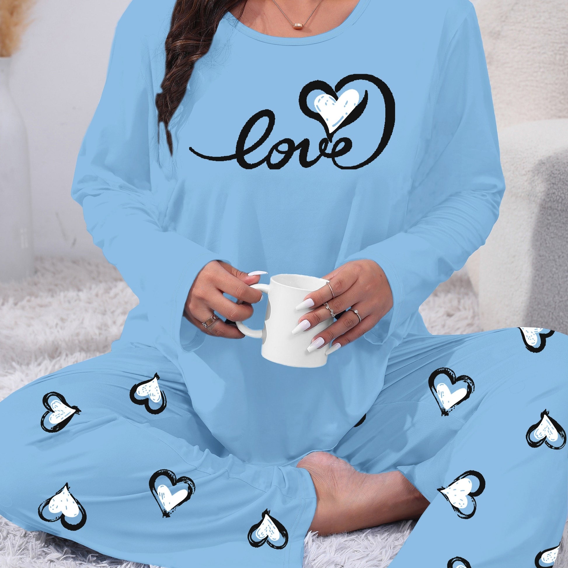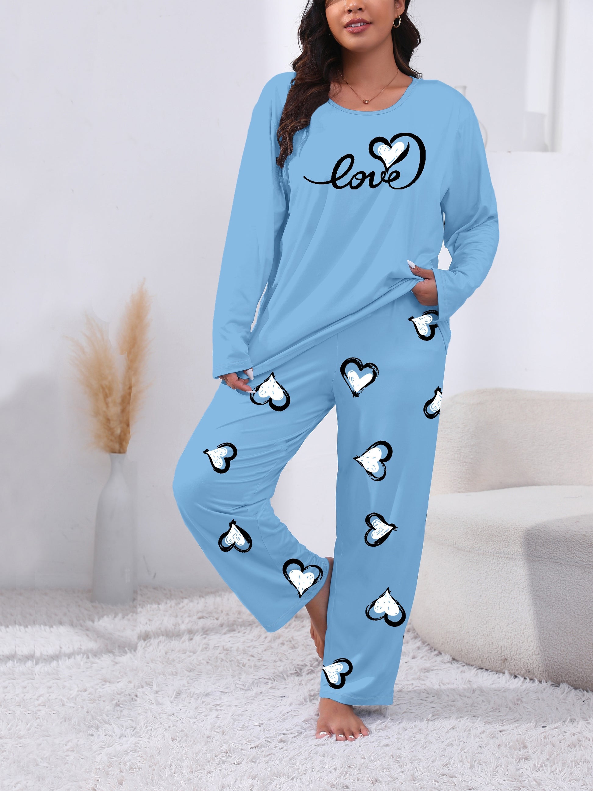 Plus Size Women's Knit Pajama Set Long Sleeve Heart Print Lounge Sleepwear