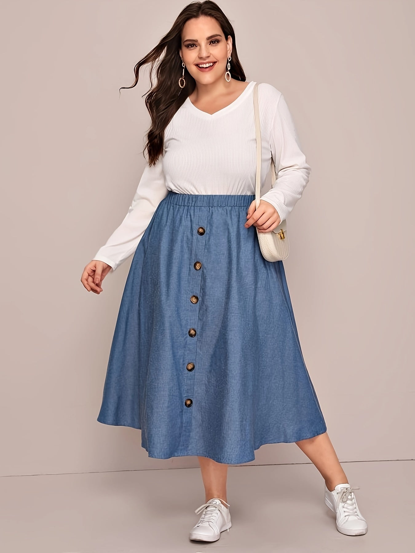 Plus Size Women's Light Blue A-Line Midi Skirt with Elastic Waist