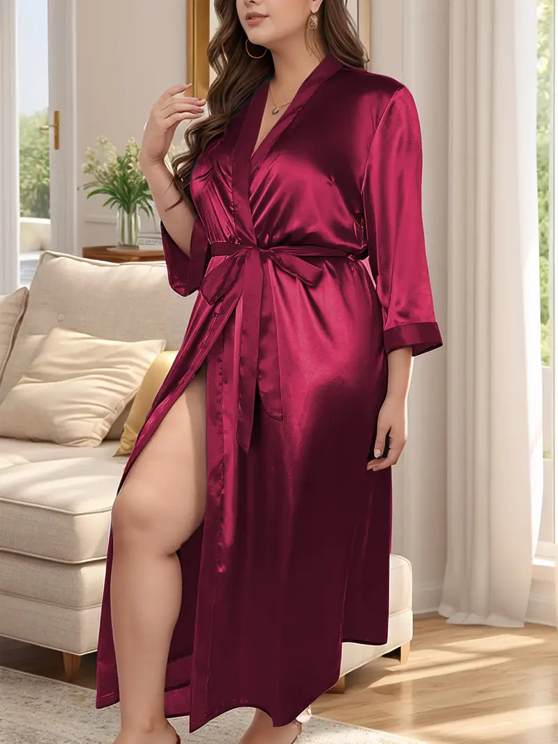 Plus Size Women Satin Robe Long Sleeve Belted Solid Black Lounge Wear