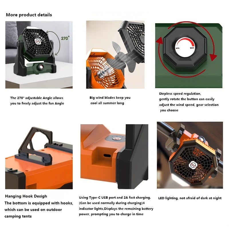 Rechargeable Camping Fan with LED Light and 7800mAh Battery, Adjustable Speed, USB Powered