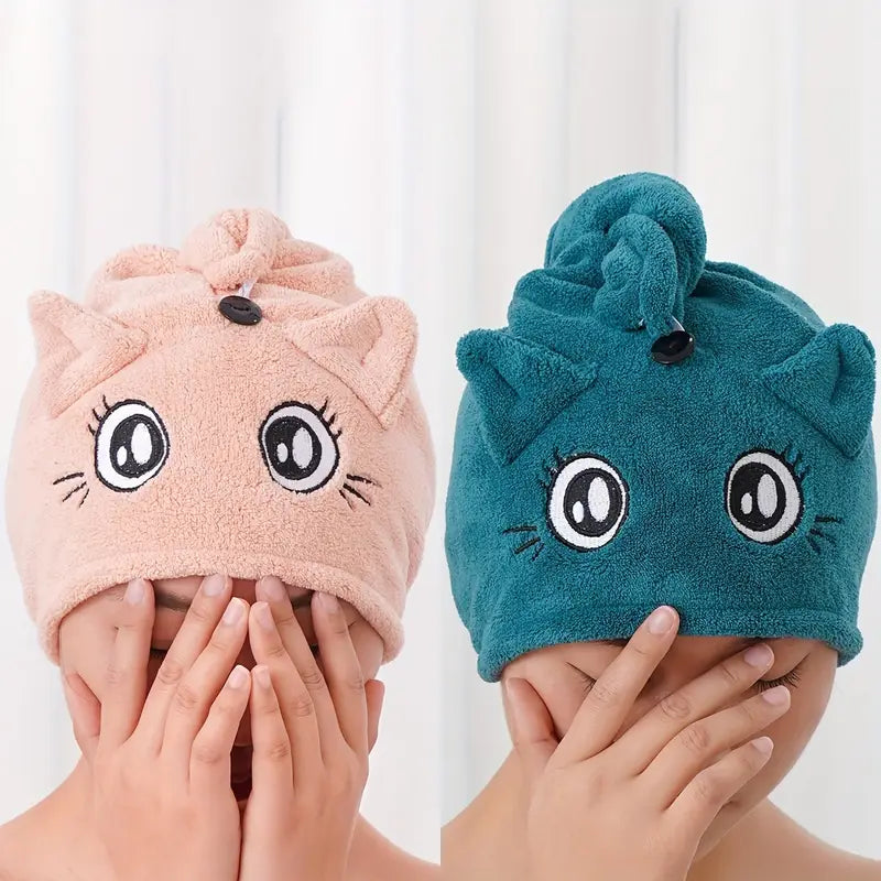 Women's Quick-Dry Hair Towel Wrap with Cute Cat Design Ultra-Soft Coral Fleece