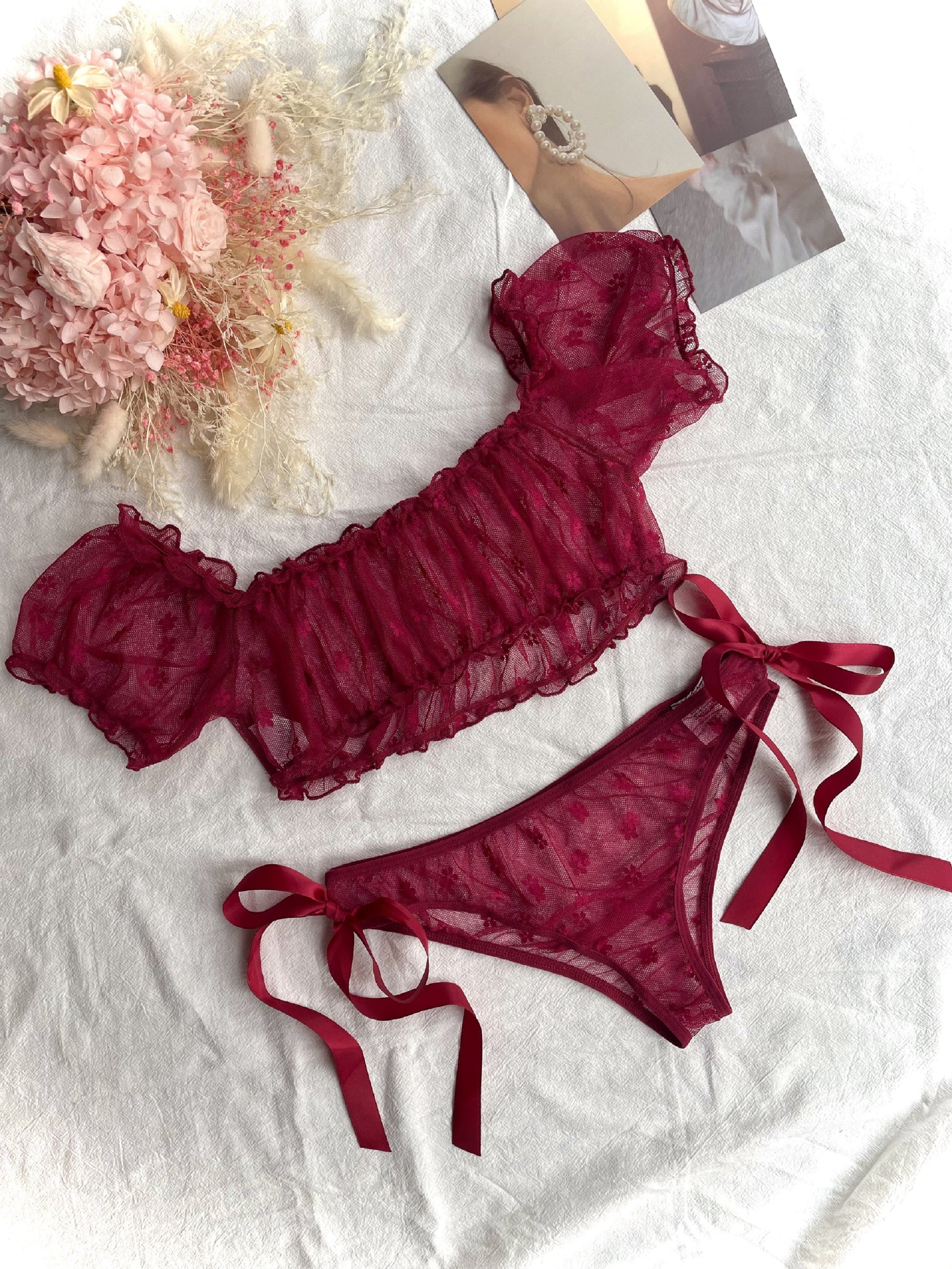 Women's Red Lace Lingerie Set with Off-Shoulder Bra and Low-Rise Panties