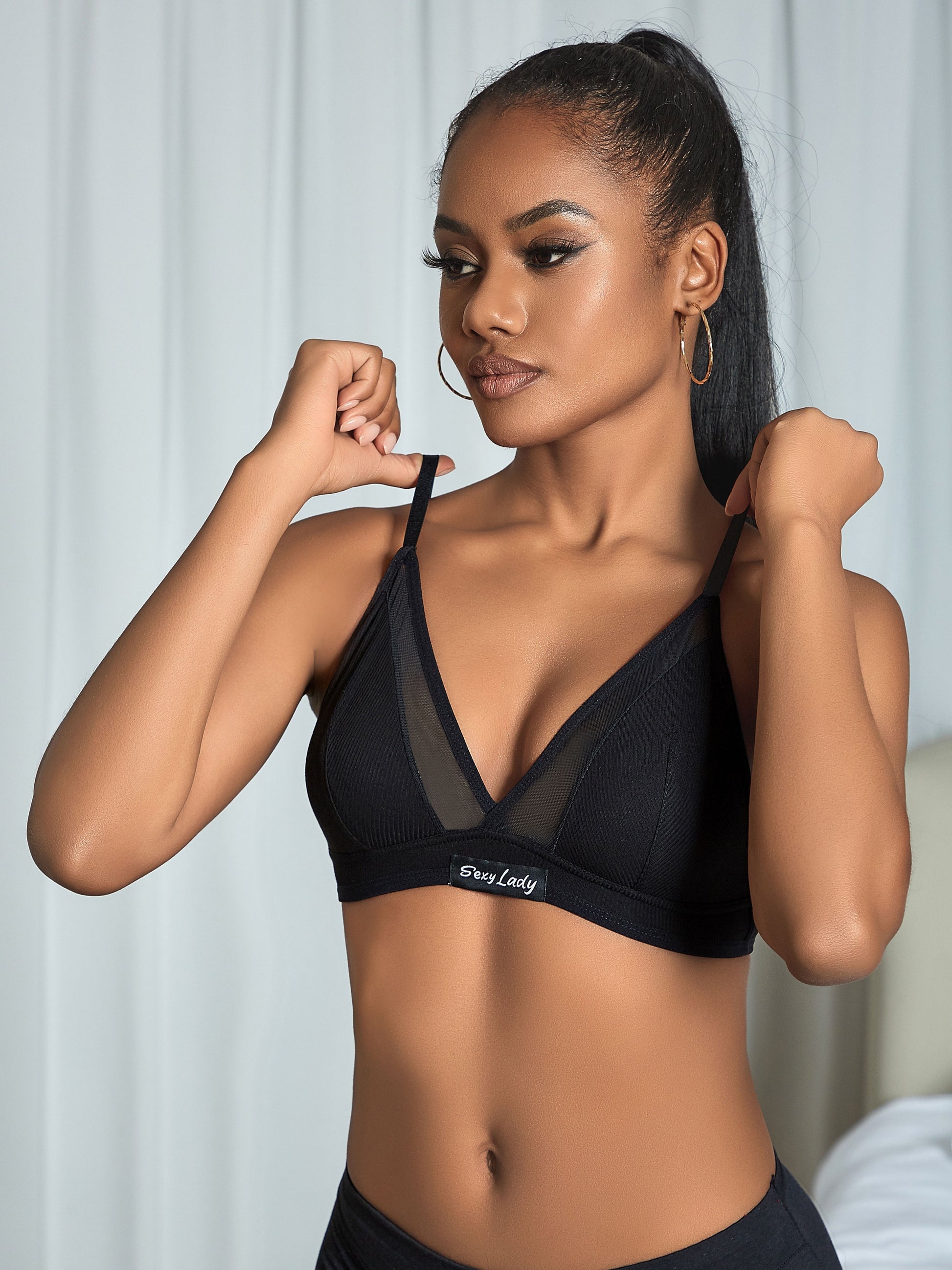 Women's Seamless High-Elasticity Black Bra with Breathable Mesh V-Neck and Soft Viscose Elastane Fabric