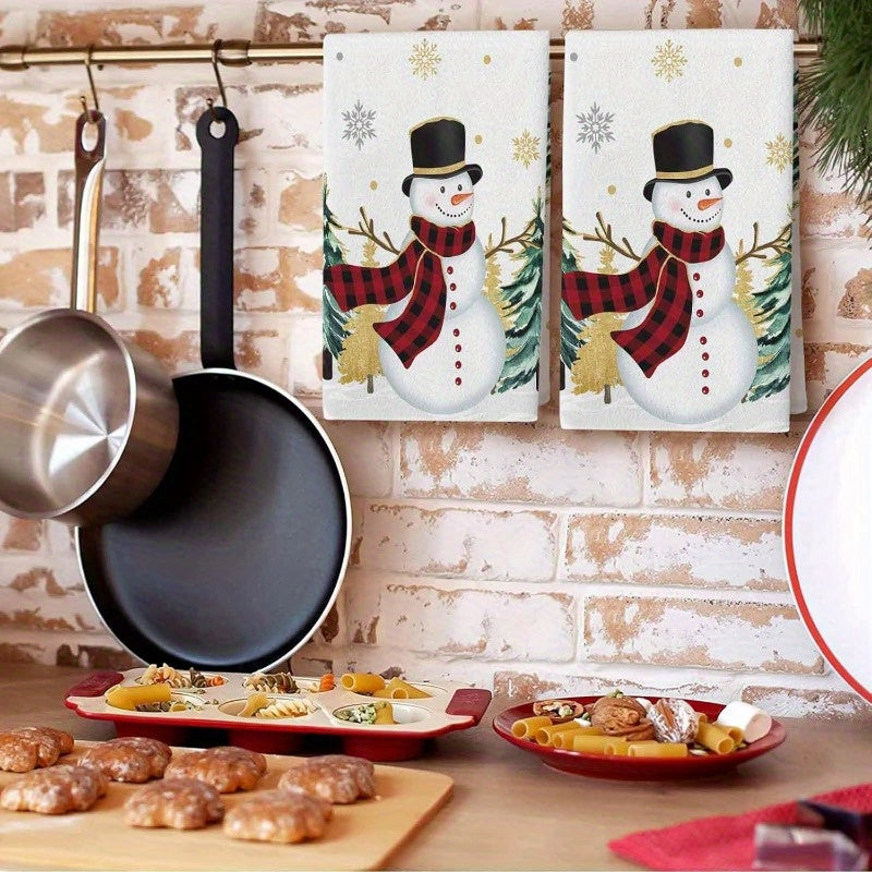 Set of 2 Christmas Kitchen Towels Snowman Tree Gold Snowflakes Absorbent Soft