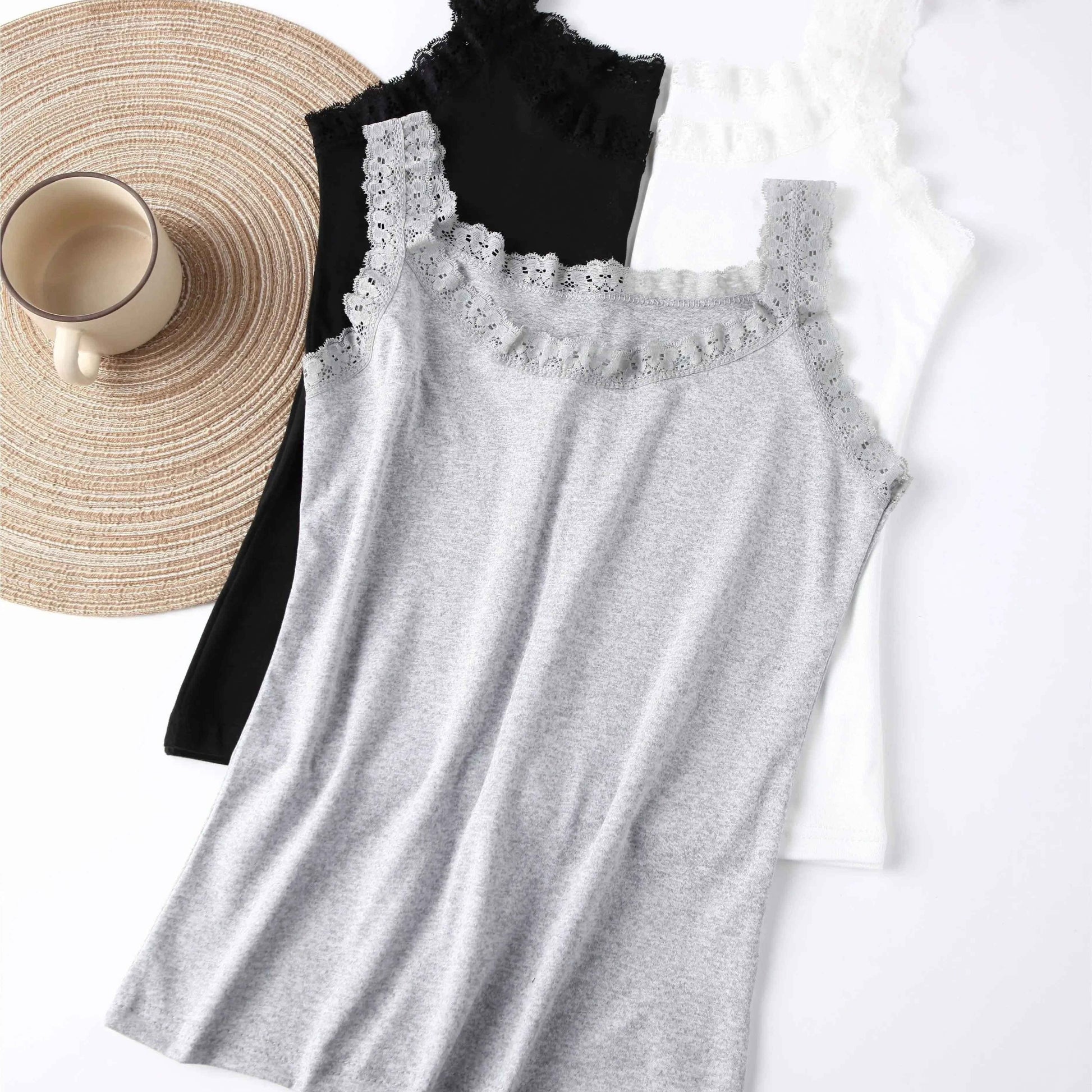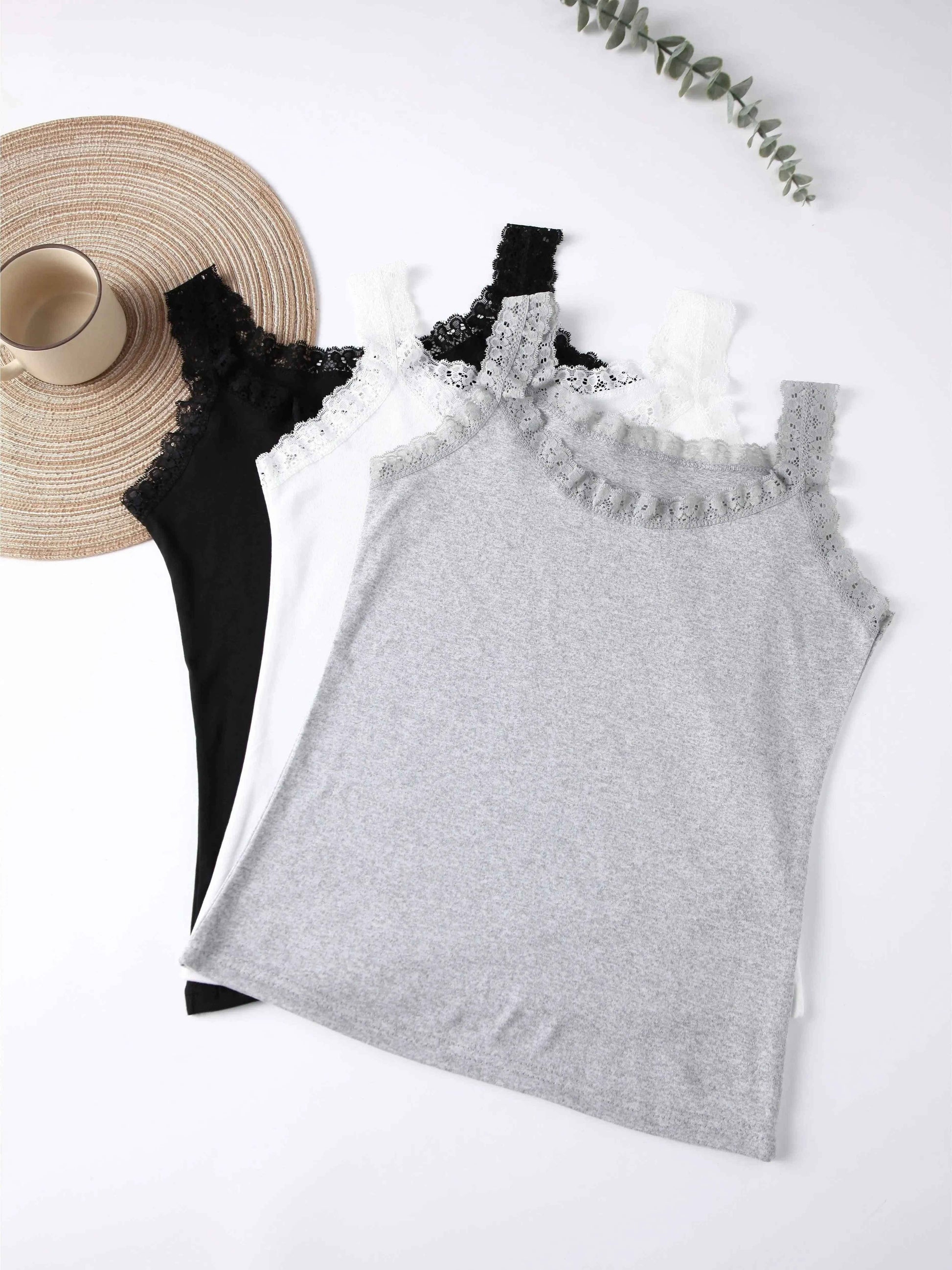 Set of 3 Women's Lace Trim Tank Tops Soft Nylon Blend Solid Colors Casual Wear