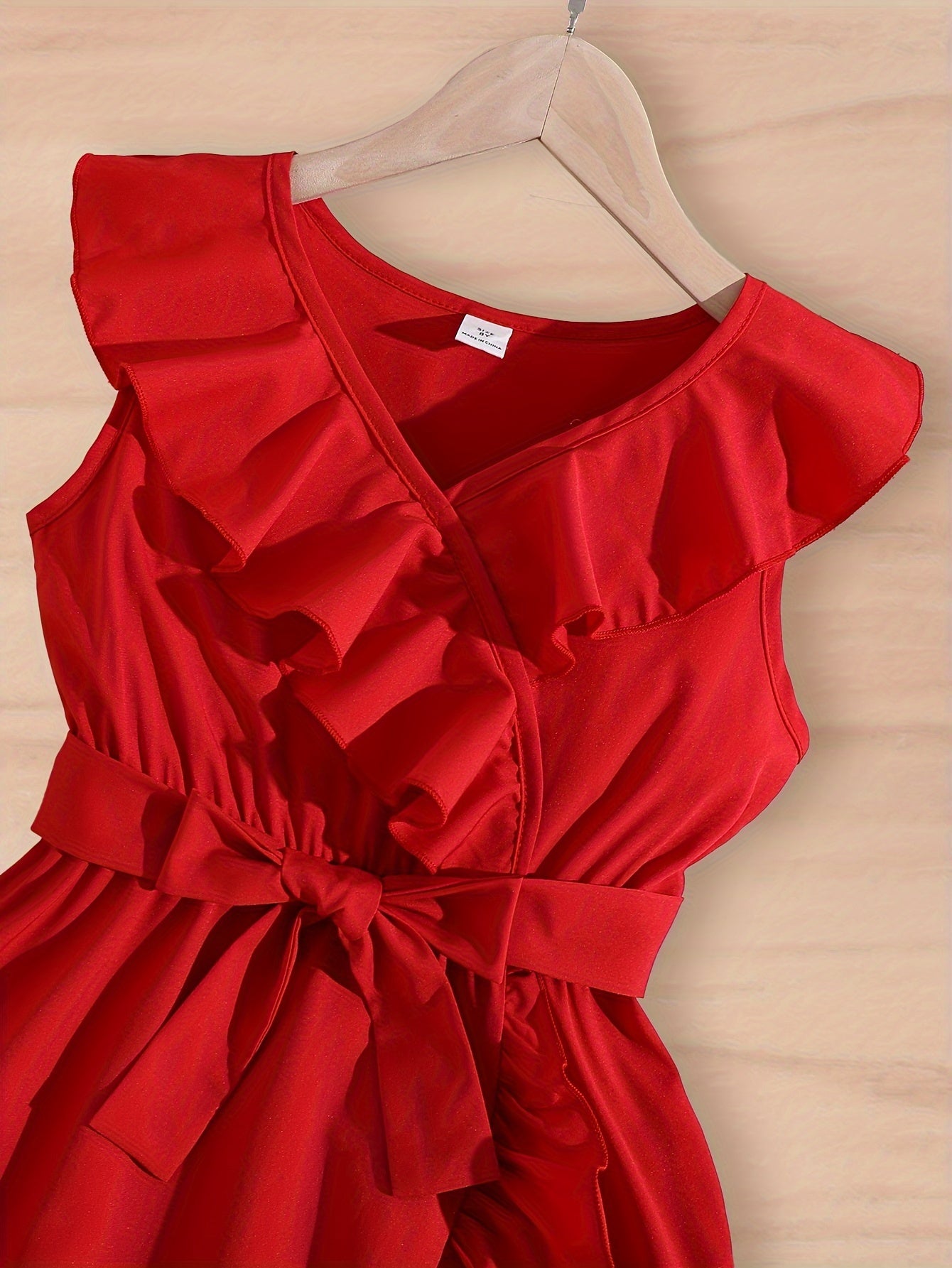 Children's Summer Dress Sleeveless Ruffle Trim Belted Solid Polyester Casual