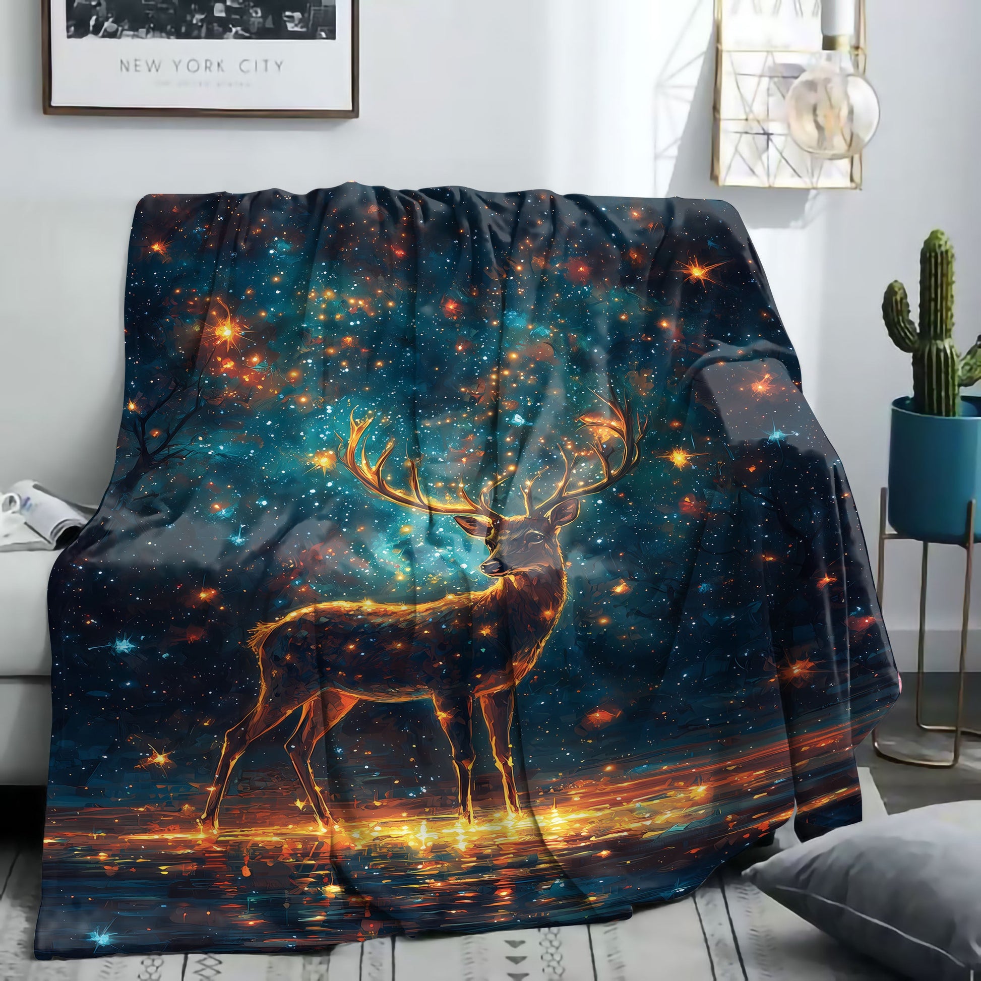 Starry Sky Deer Print Flannel Blanket All-Season Cozy Throw for Bed Sofa Camping
