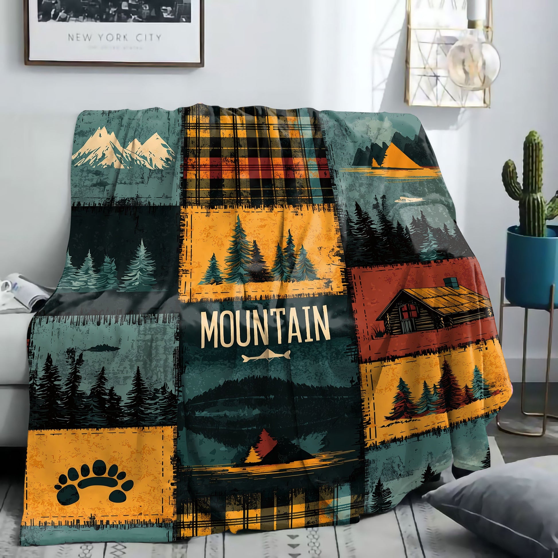 Polyester Knit Throw Blanket with Mountain and Forest Patchwork Design for Bed Sofa Camping