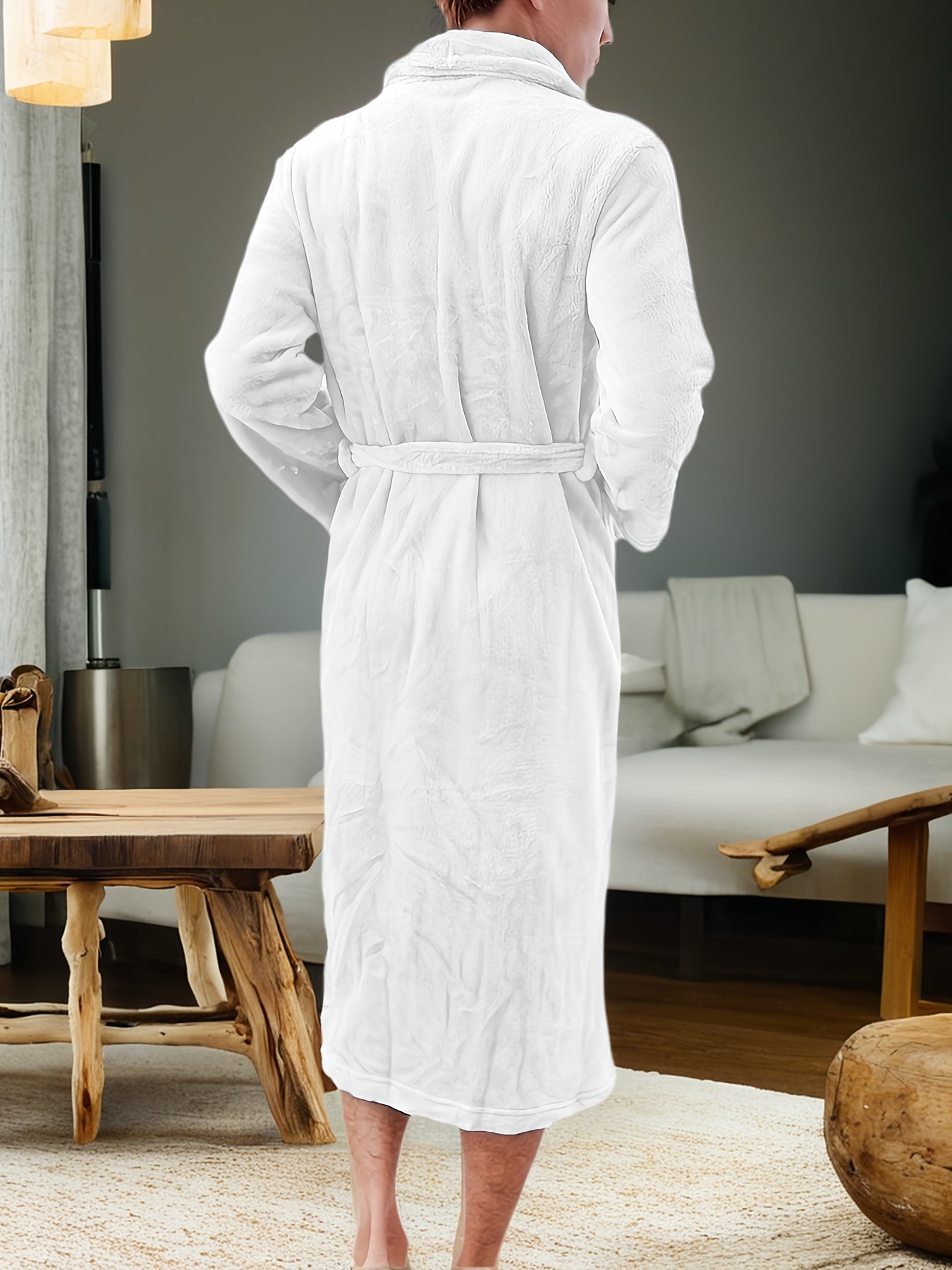 Men's White Fleece Bathrobe with Pockets V-Neck Long Sleeves Belted Kimono Style for Home Spa