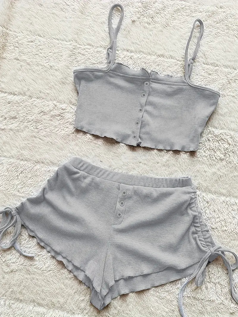 Women's Solid Knit Lounge Set with Camisole Top and Drawstring Shorts for Summer