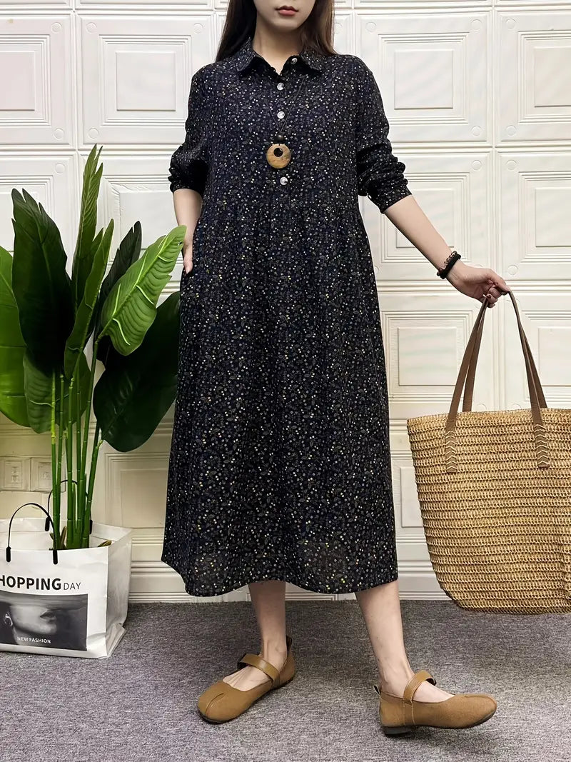Women's Linen Dress with Floral Pattern, Long Sleeve, Lapel Collar, Beach Vacation Style