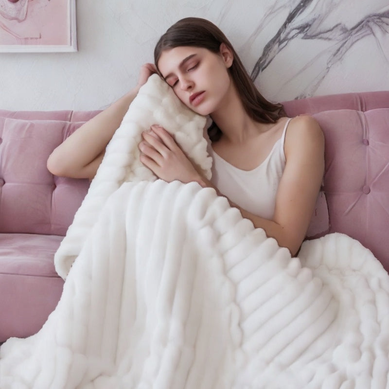 Plaid Rabbit Fur Throw Blanket Polyester Cozy Home Accessory