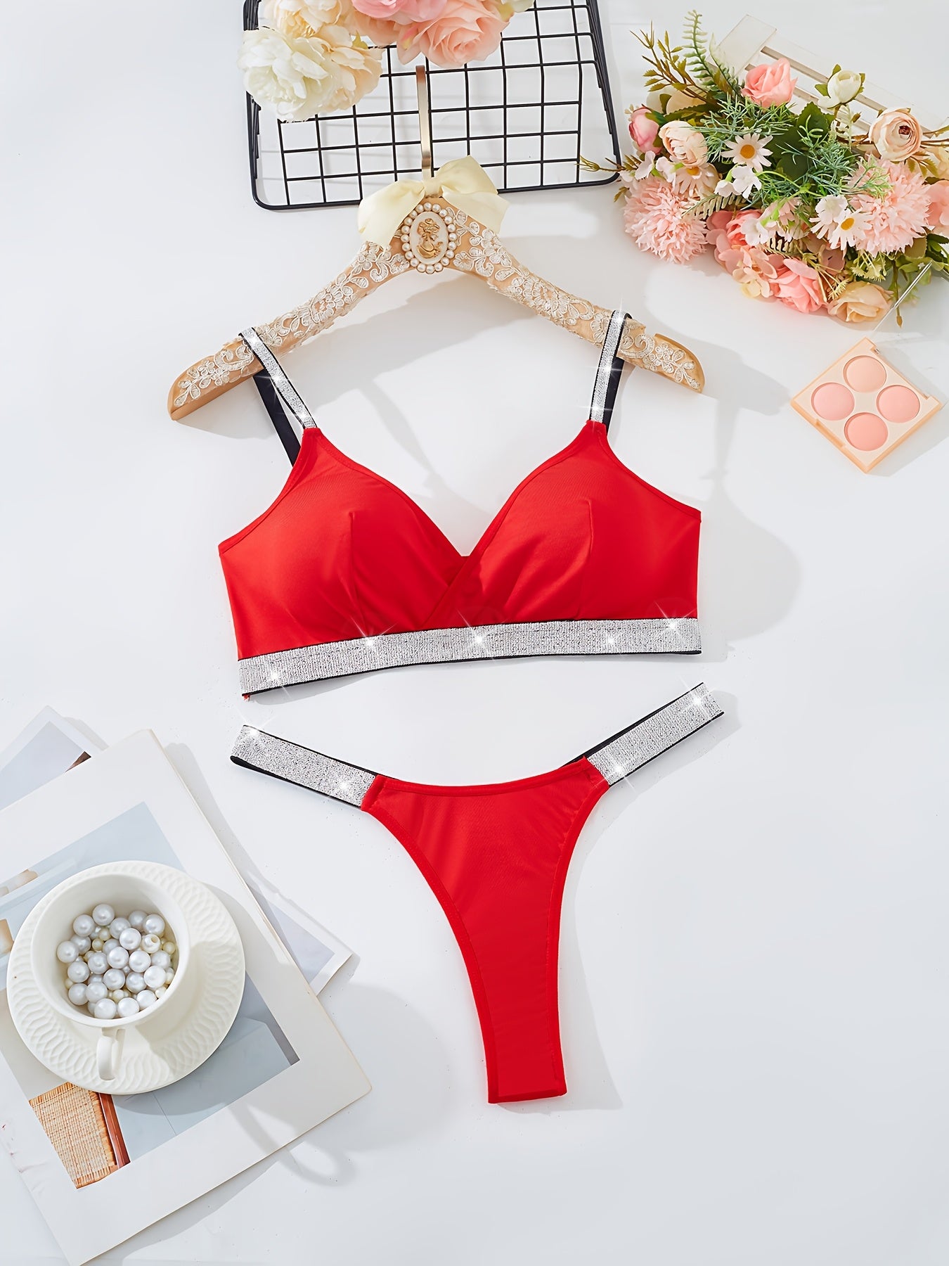 Silver Lingerie Set for Women, Strappy Polyester Knit Bralette and Thong