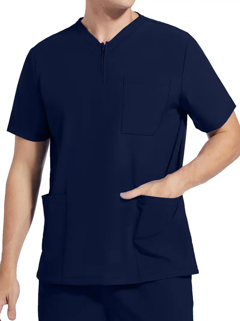 Men's Short Sleeve Stretch Work Uniform Lab Shirt with Pockets V-Neck Polyester